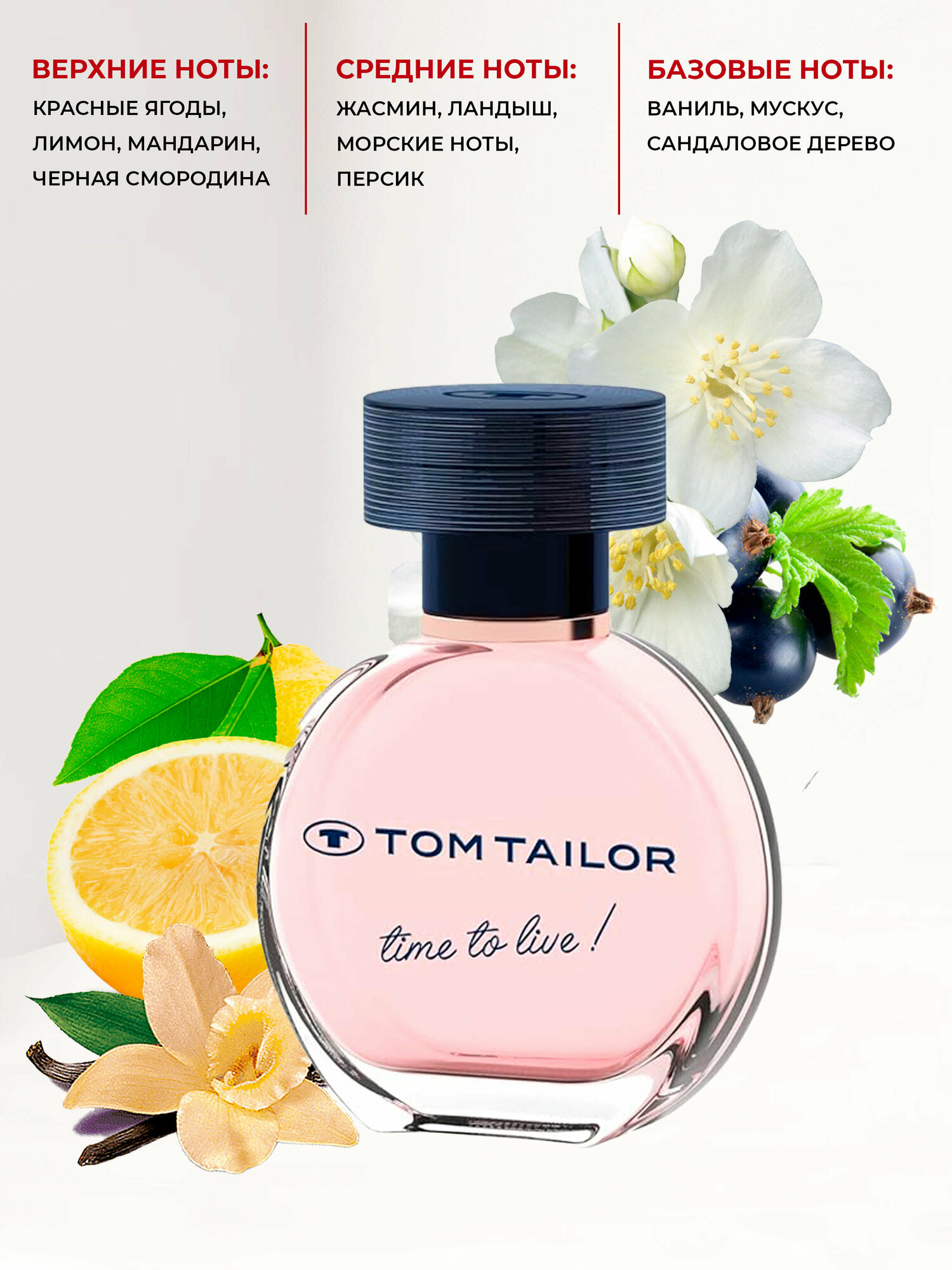 | Ноты | красные ягоды / персик / лимон / ландыш / ваниль / черная смородина / морские / мандарин / сандал / жасмин / мускус |