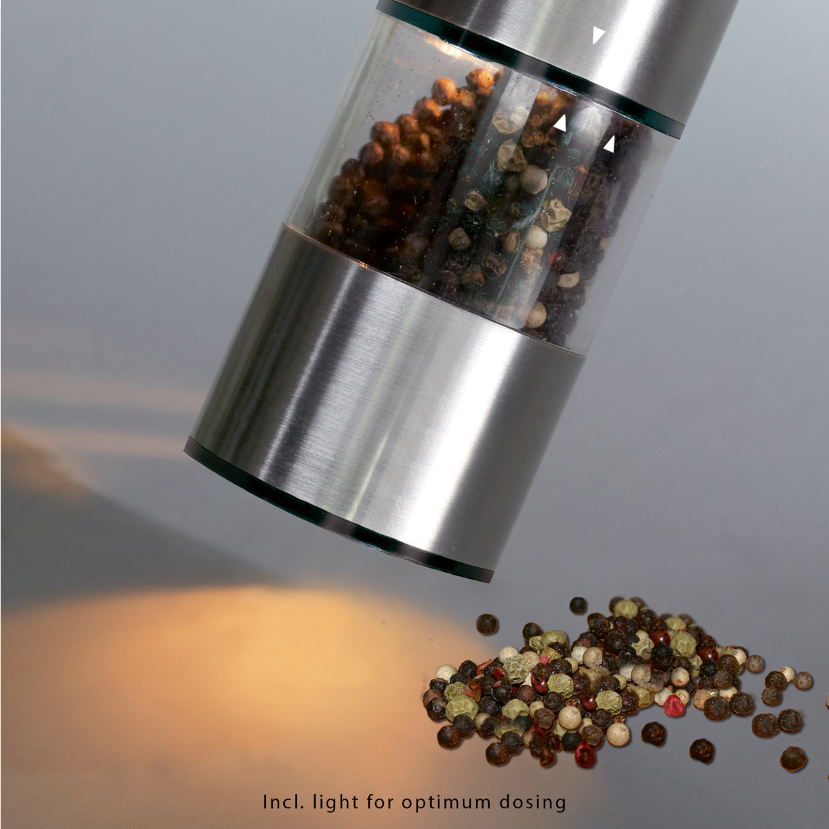 | Плюсы: | Удобно. Хорошо перемалывает как соль так и перец. Подсветка помогает контролировать сколько специй сыпется. |