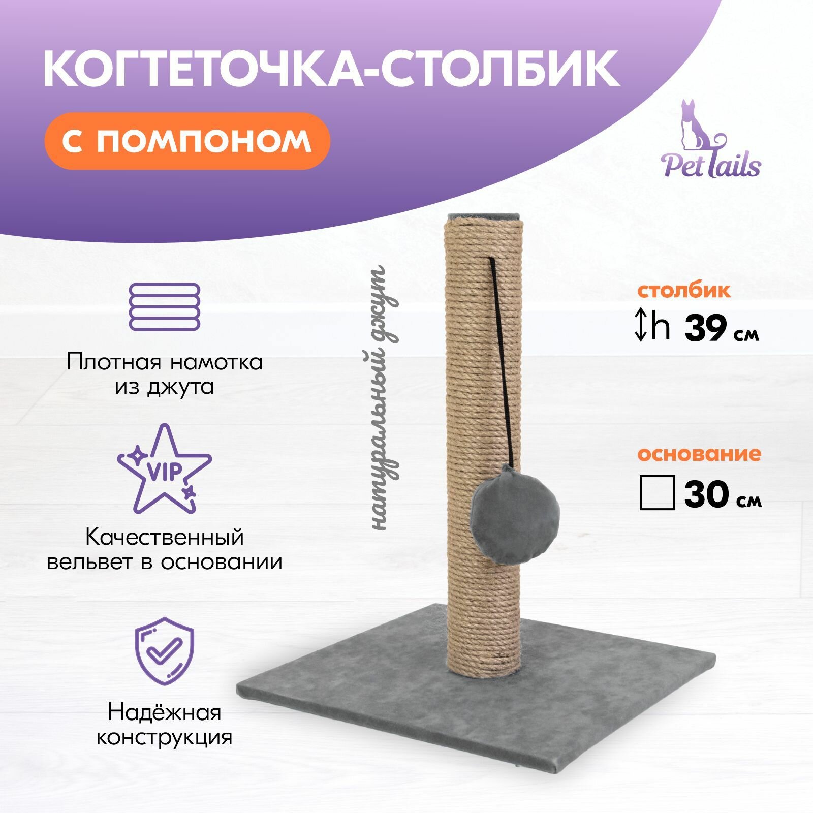 Купить Когтеточка-столбик вельвет "PetTails" квадратная с помпоном 30х30хh39см (джут, ткань вельвет) серая