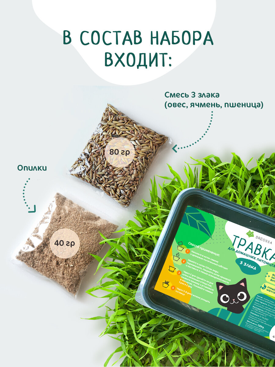 Травка для кошек в лотке DREOSSA 120 гр. 3 злака интересное: