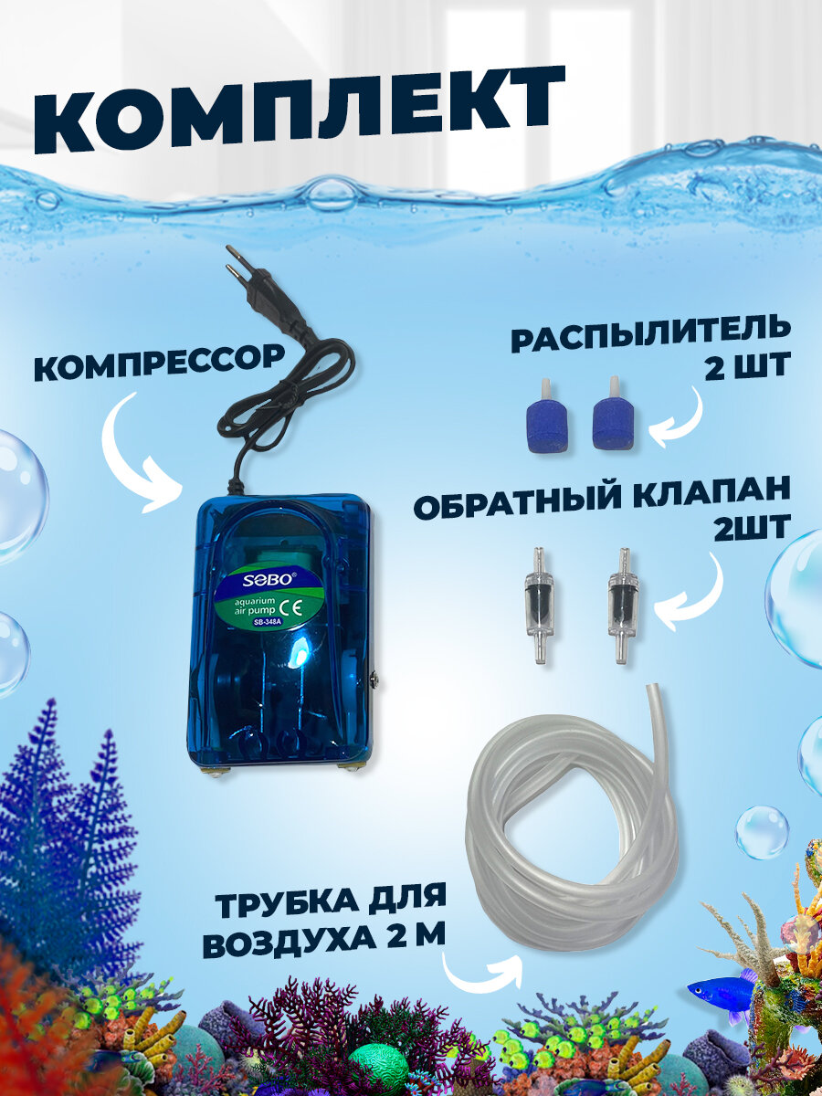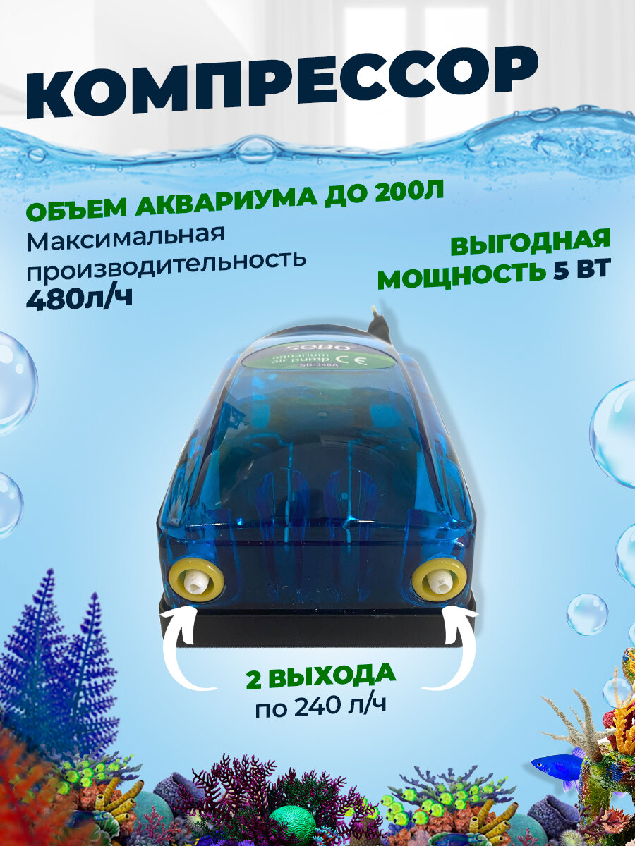 Компрессор для аквариума SB-348 - 2х4л/мин, 5 Вт двухканальный, до 200 литров интересное: