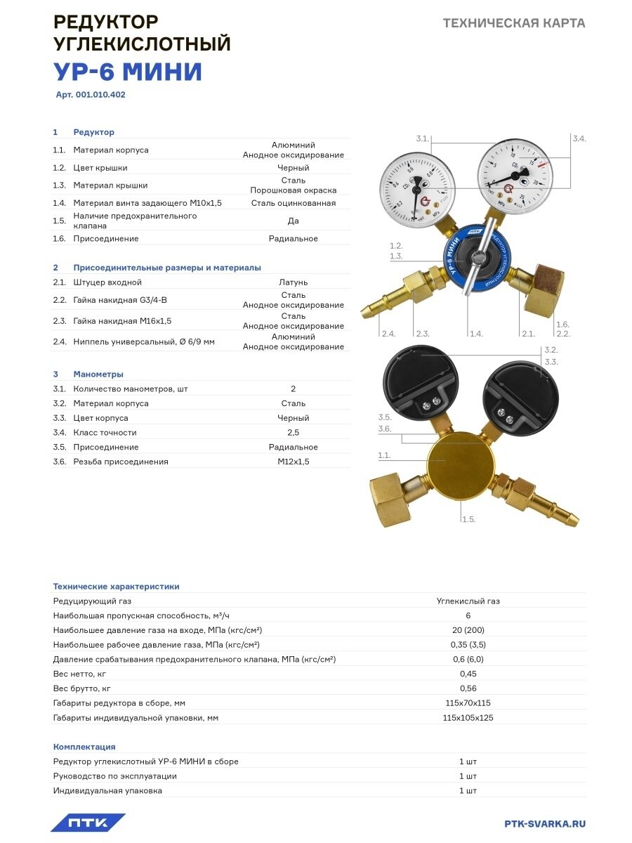| Дополнительная информация | присоединение к баллону: радиальное; давление срабатывания предохранительного клапана: 0,6 (6,0) МПа (кгс/см²); укомплектован универсальным ниппелем, что позволяет использовать резинотканевые рукава с внутренним диаметром 6 и 9 мм без дополнительных переходников; допускается прикладывать отдельно (в общей упаковке): ниппель, гайку накидную для крепления ниппеля и регулирующий маховик или винт |