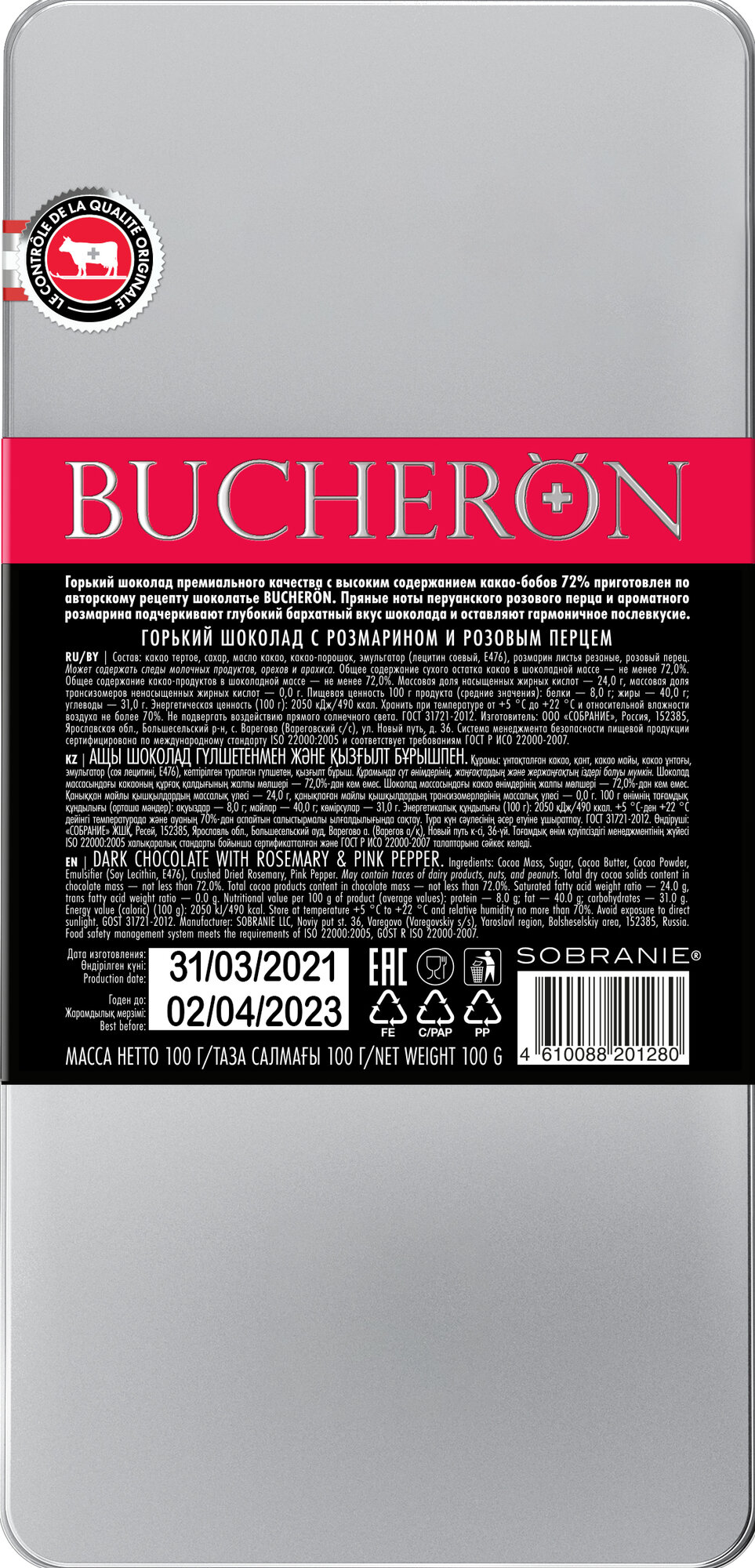 | Состав | какао тертое, сахар, масло какао, какао-порошок, эмульгаторы (лецитин соевый, E476), розмарин листья резаные, розовый перец |