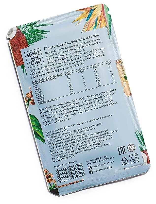 Шоколад Гречишный с кокосом Nature's own factory, 6*20 г интересное:
