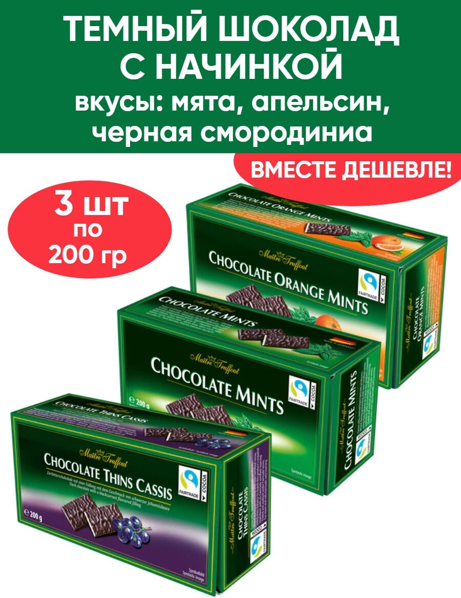 Купить Темный шоколад с мятной начинкой, апельсиновой и смородиновой начинкой в пластинках, 200 г, 3шт.