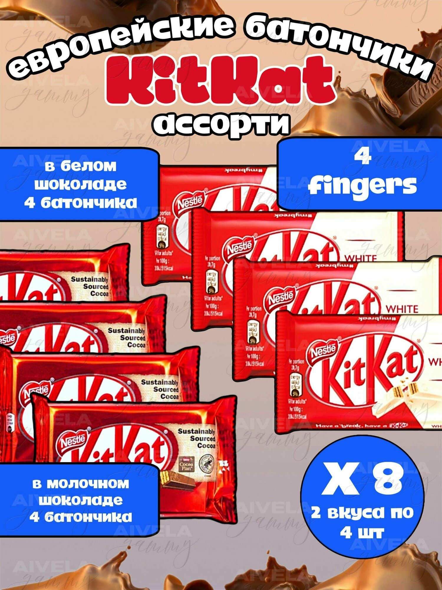 Ассорти вафельных шоколадных батончиков KitKat 4 Fingers 8 шт/ Киткат шоколад 4 пальца 4 шт белый и 4 шт классический (Европа) интересное: