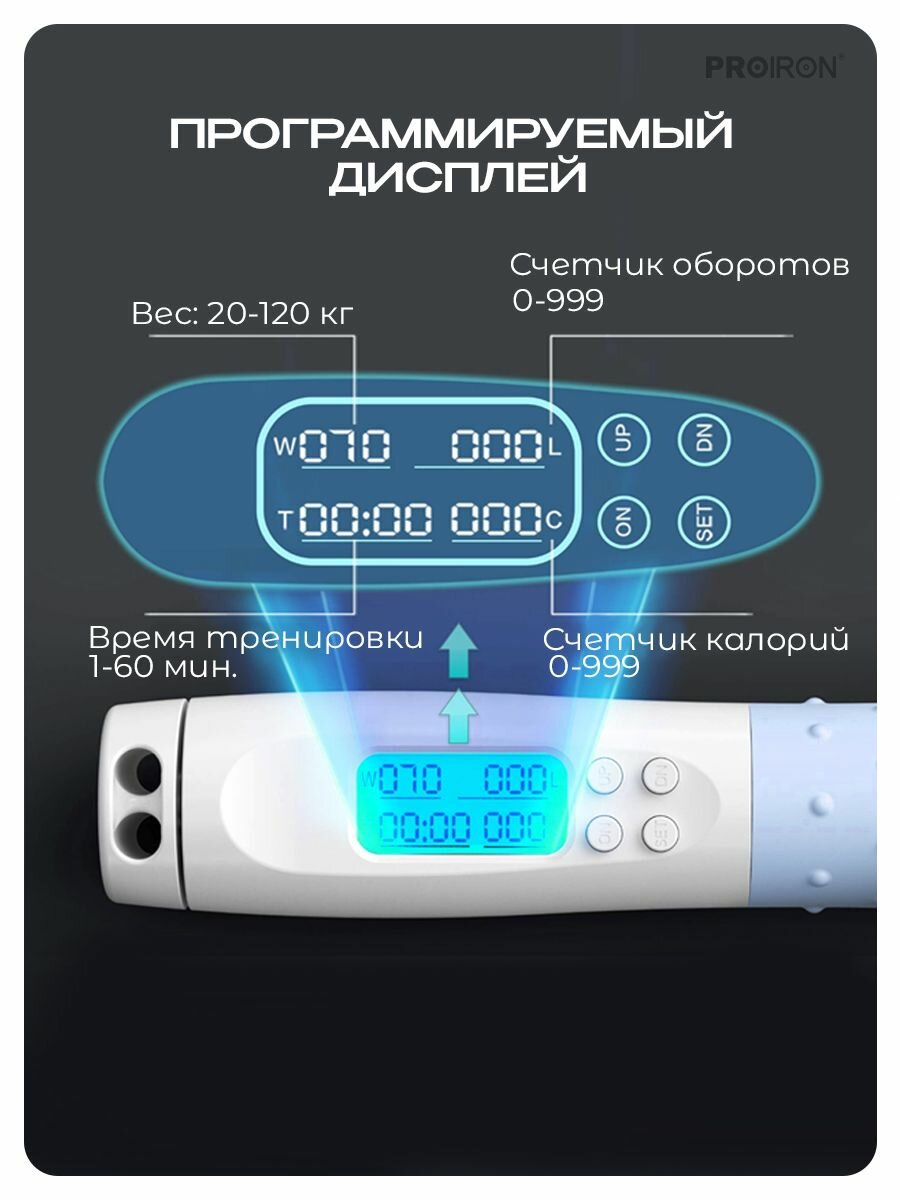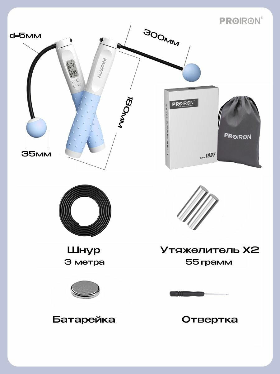 Скакалка для фитнеса взрослая, умная, со счетчиком, PROIRON ПРО042, с утяжелителями, бело-голубая интересное: