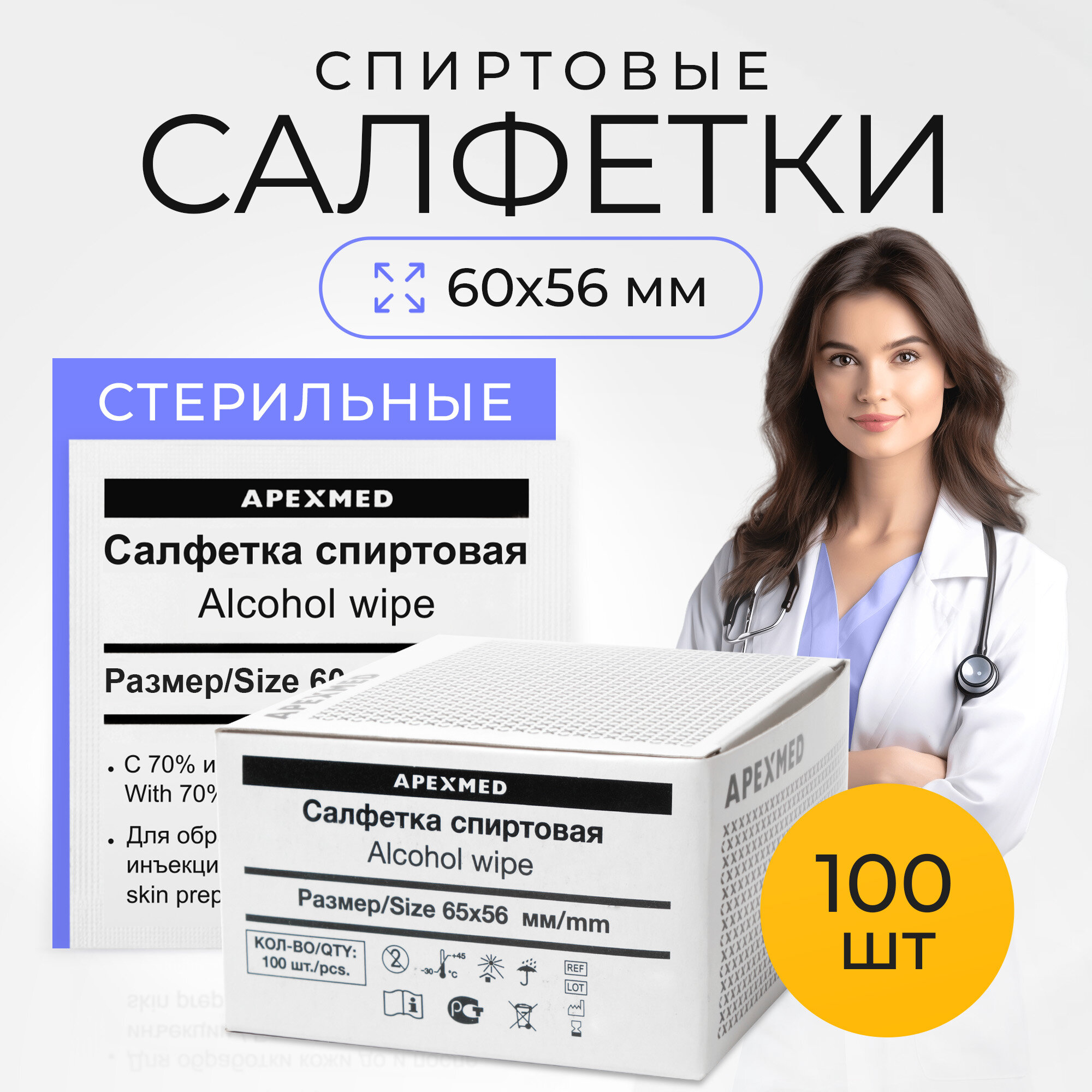 Салфетка спиртовая для инъекций, стерильная, 65х56 мм, 100 шт, Apexmed интересное: