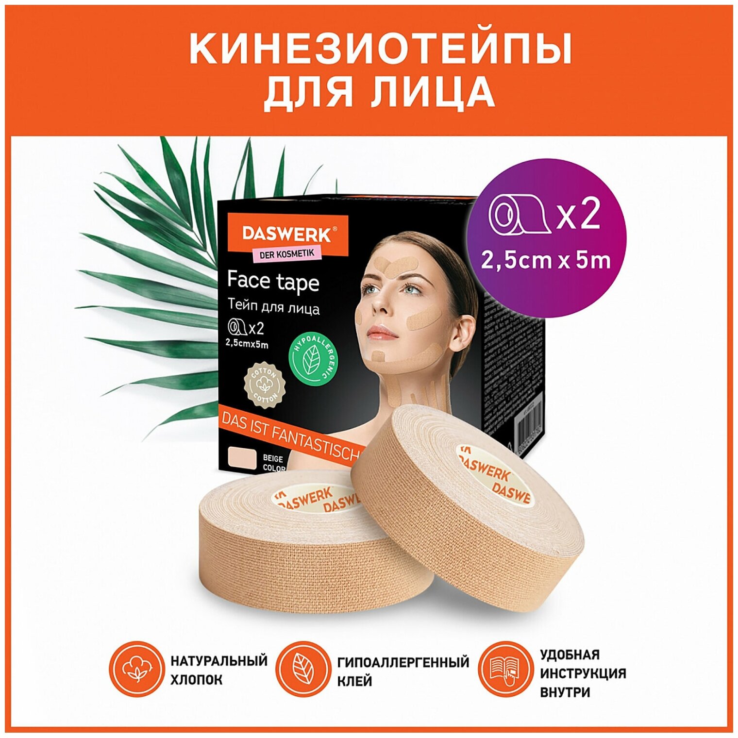 Кинезио Daswerk тейп/лента для лица, лифтинг эффект, 2,5 см х 5 м, комплект, 2 рулона, бежевый, , 680012