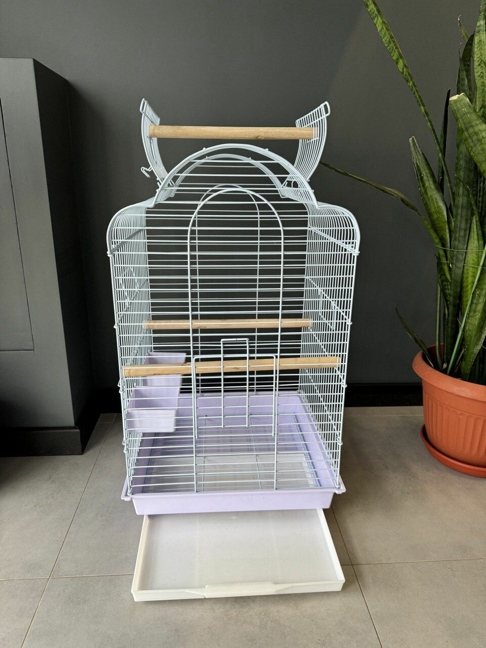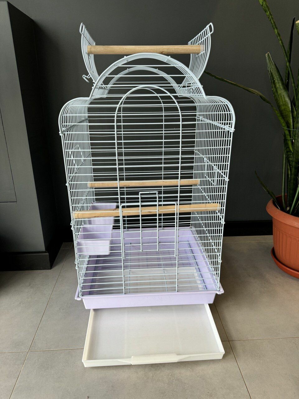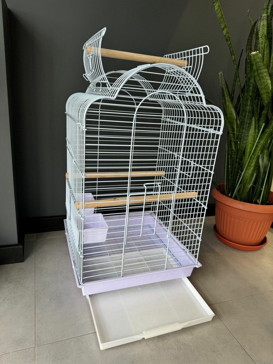 Клетка для птиц, 48х37х72.5 см., открывающийся верх, выдвижной поддон, фальшдно, поилки-кормушки, деревянные жердочки, белый