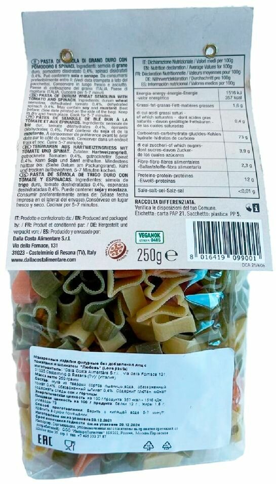 Ниже Вы можете прочитать отзывы на Макаронные изделия Dalla Costa Любовь, Фигурные со шпинатом и томатами, 250 г, ознакомится с подробными характеристиками, посмотреть интересные обзоры и фотографии на Макаронные изделия Dalla Costa Любовь, Фигурные со шпинатом и томатами, 250 г.