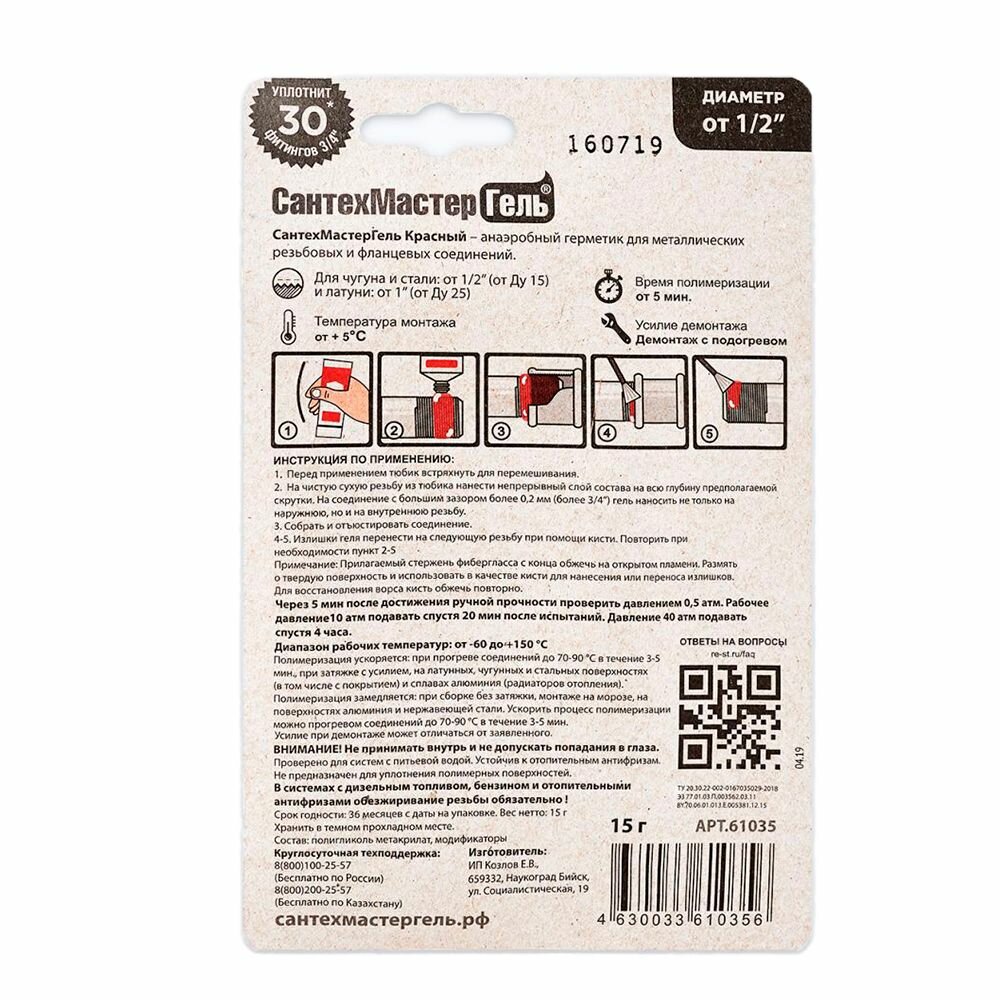 Герметик анаэробный, 35 г Сантехмастер Гель, красный (5 мин) для воды, газа, топлива - сантехнический уплотнитель для резьбовых соединений до 3"