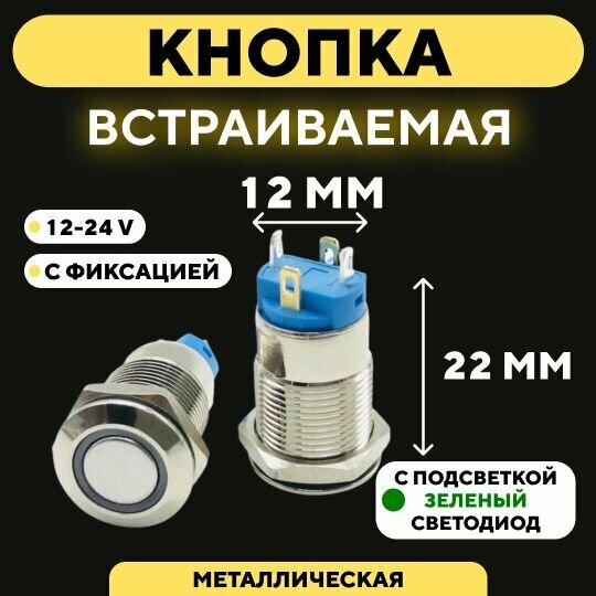 Кнопка встраиваемая в корпус металлическая с индикатором (12-24 В, 12 мм) / Зеленый / С фиксацией / Круг интересное: