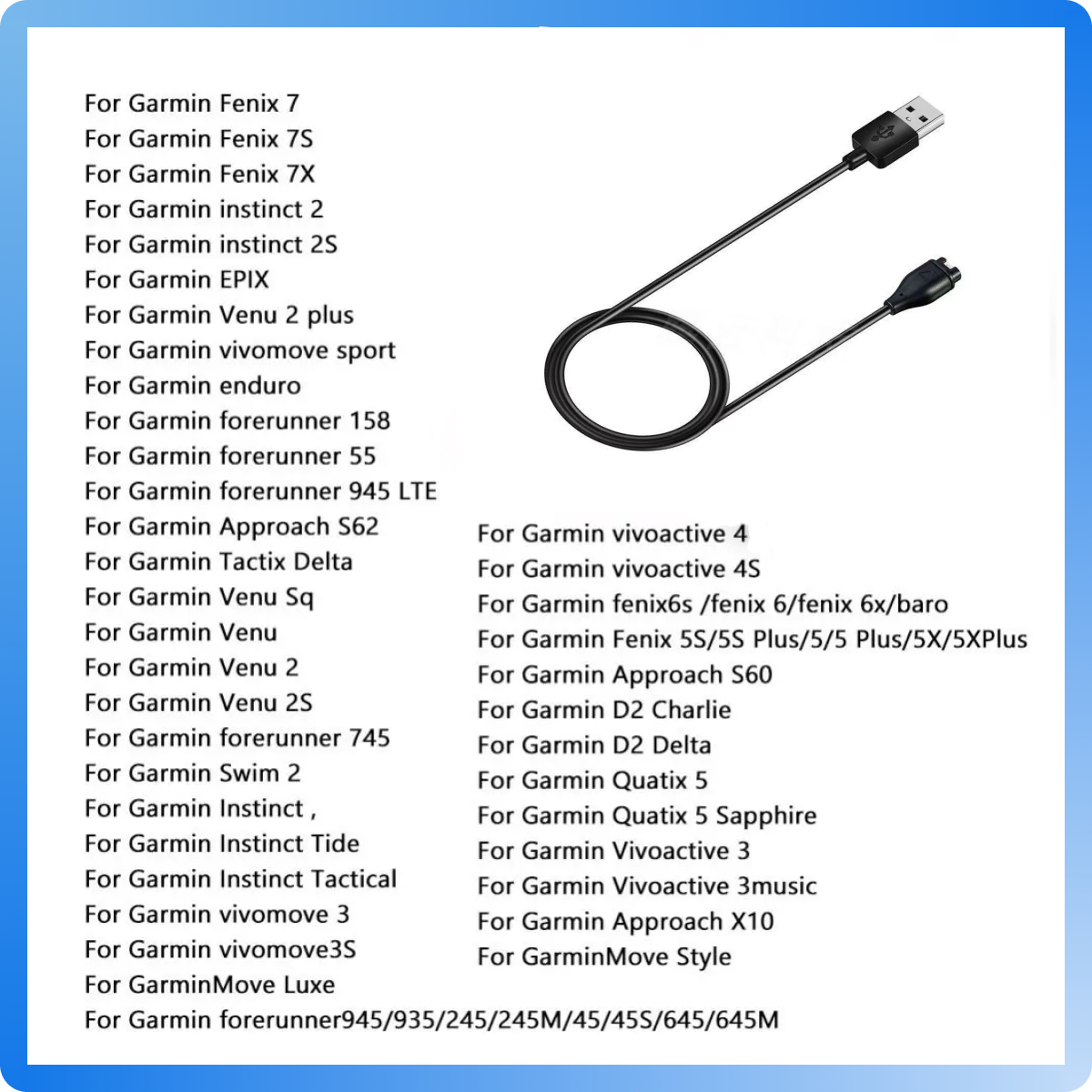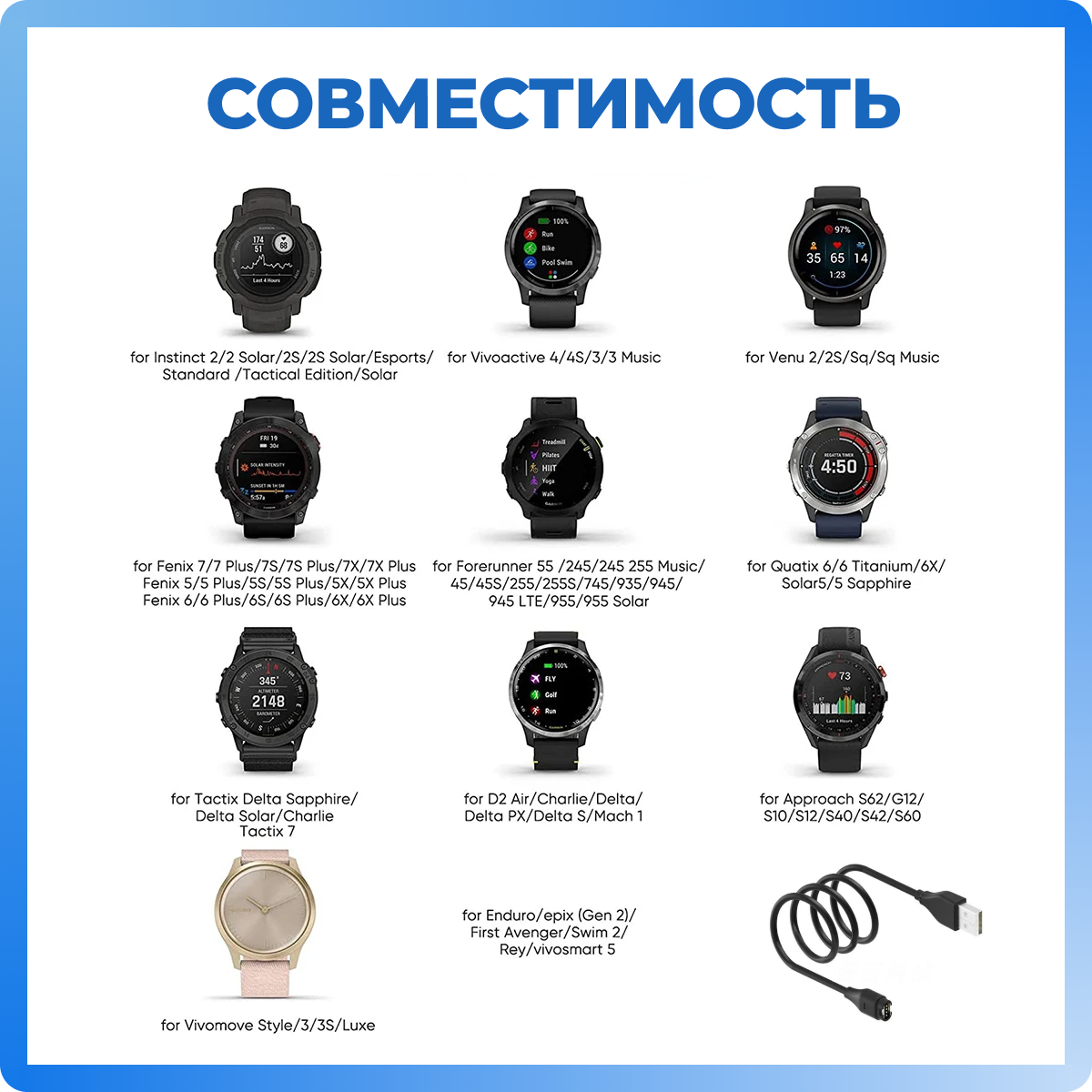 | Дополнительная информация | Fenix 5, 5S, 5X, 5X Plus Fenix 6, 6X PRO Solar, Venu Approach S40, S60, X10, S10 Forerunner45, 45S, 245, 245M, 935, 945 Active Quatix 5 Quatix 5 Sapphire Vivosport Vivoactive 3, 3T, Vivoactive 4 D2 Charlie D2 Delta PX BarkLimiter 2 instinct |