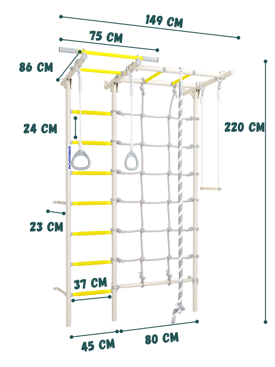 | Дополнительная информация | В детском спортивном комплексе ROMANA S7 есть все, что нужно юному искателю приключений: удобная лестница, веревочный лаз из прочного шнура, рукоход и турник. Также в комплекте идет навесное оборудование: канат, кольца и трапеция,гамак. |