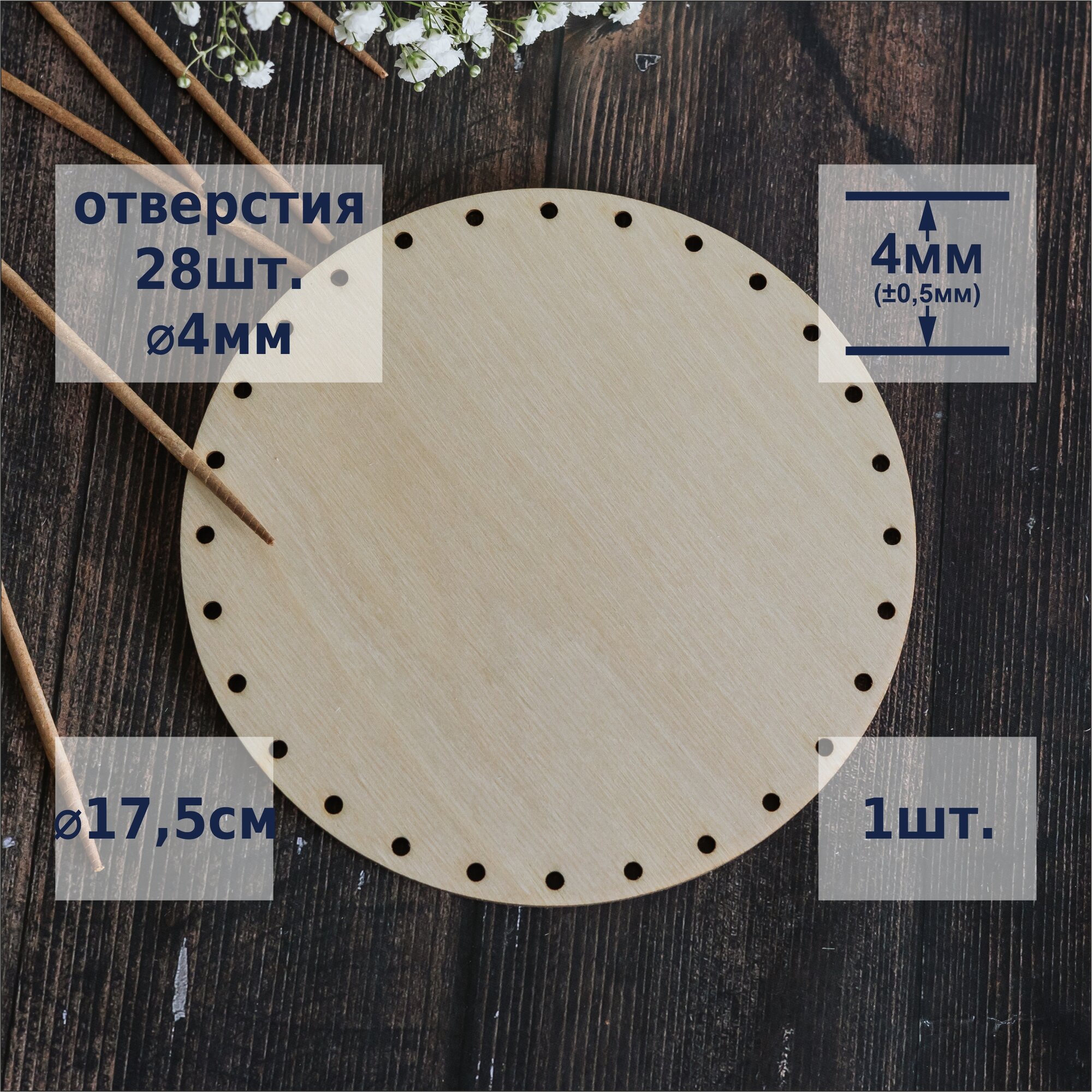 | Дополнительная информация | донышко для плетения, диаметр 10см, 14 отверстий, диаметр отверстий 4мм, толщина 4мм ±0.5мм |