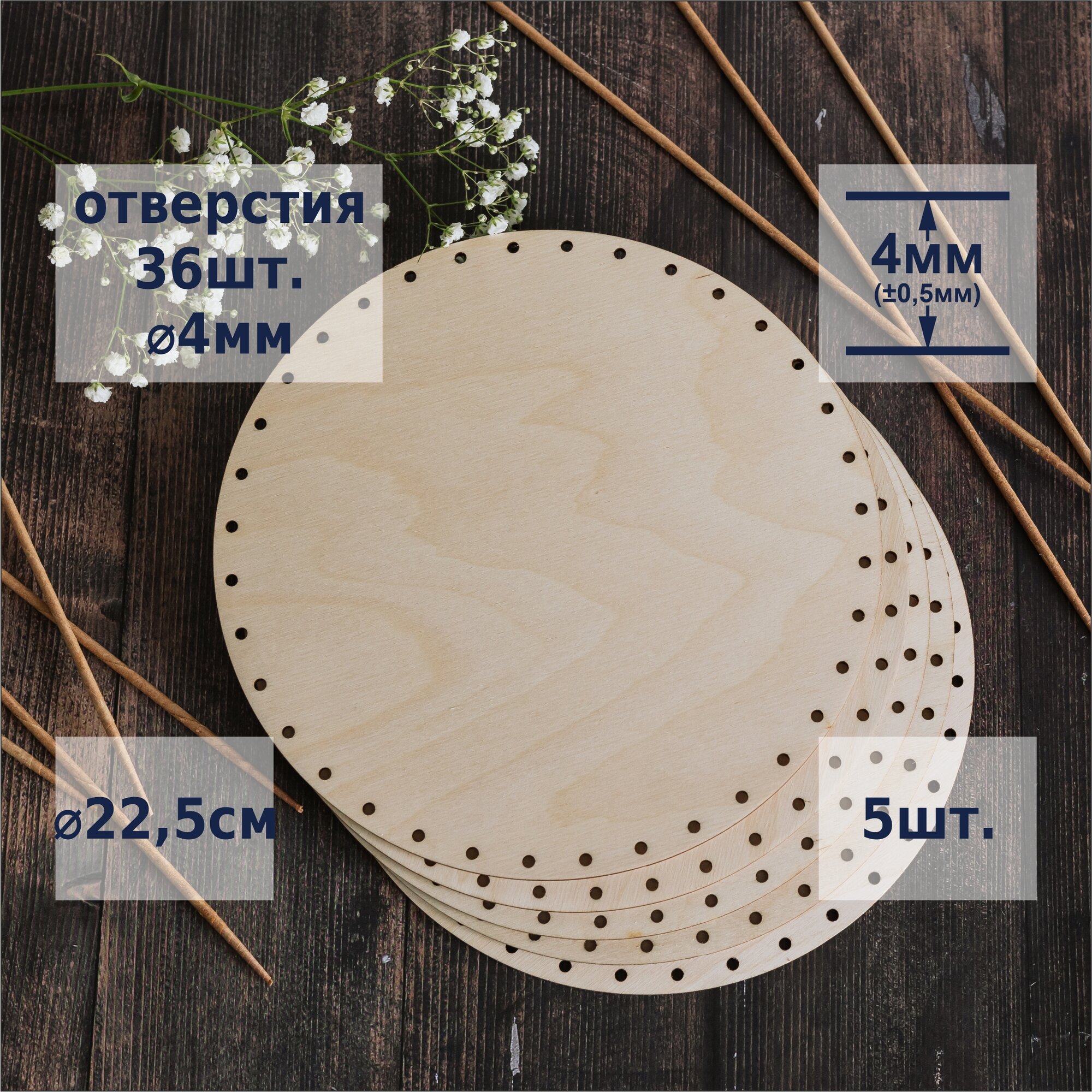 Купить ⌀ 22,5см 5шт отверстия ⌀4мм. Донышко круглое для плетения корзин из бумажной лозы толщина 4мм
