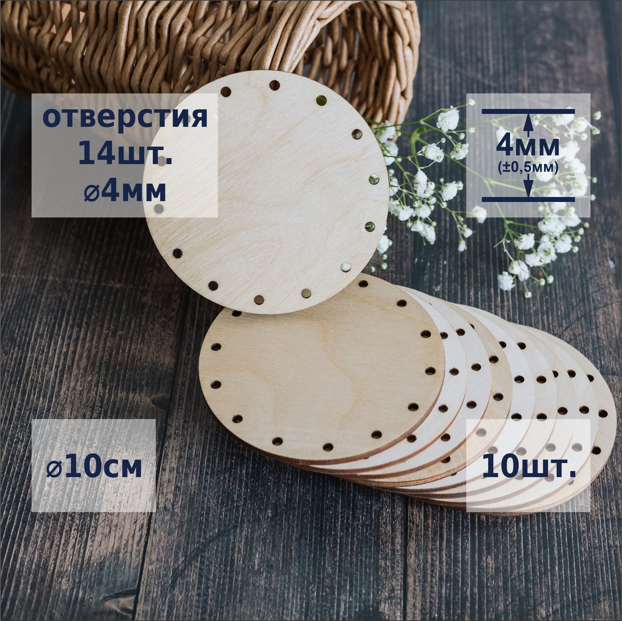 | Дополнительная информация | донышко для плетения, диаметр 10см, 14 отверстий, диаметр отверстий 4мм, толщина 4мм ±0.5мм |