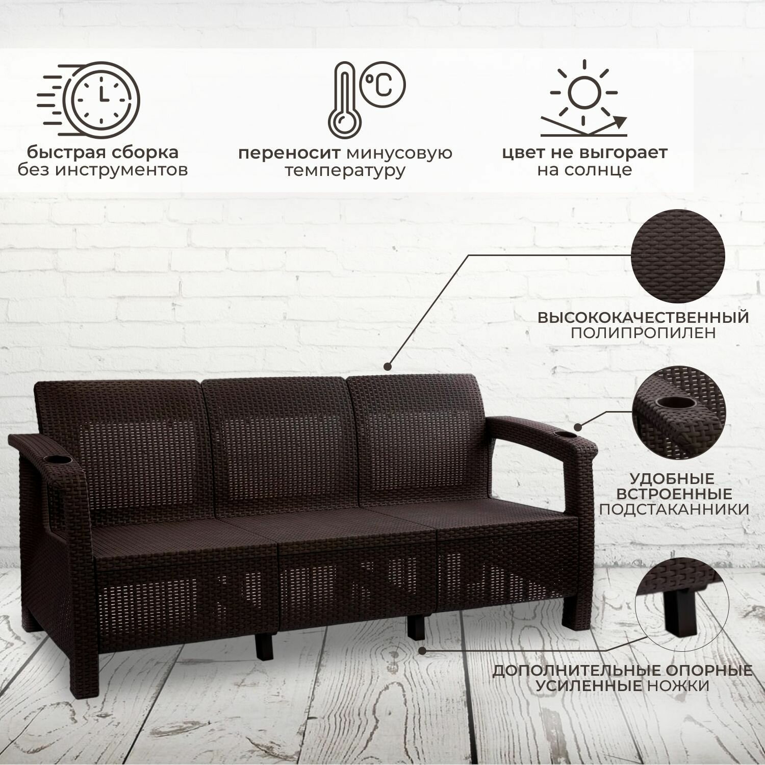 Купить Диван садовый трехместный YALTA (Ялта Ротанг-плюс) + 3 коричневые подушки (искусственный ротанг (пластик)