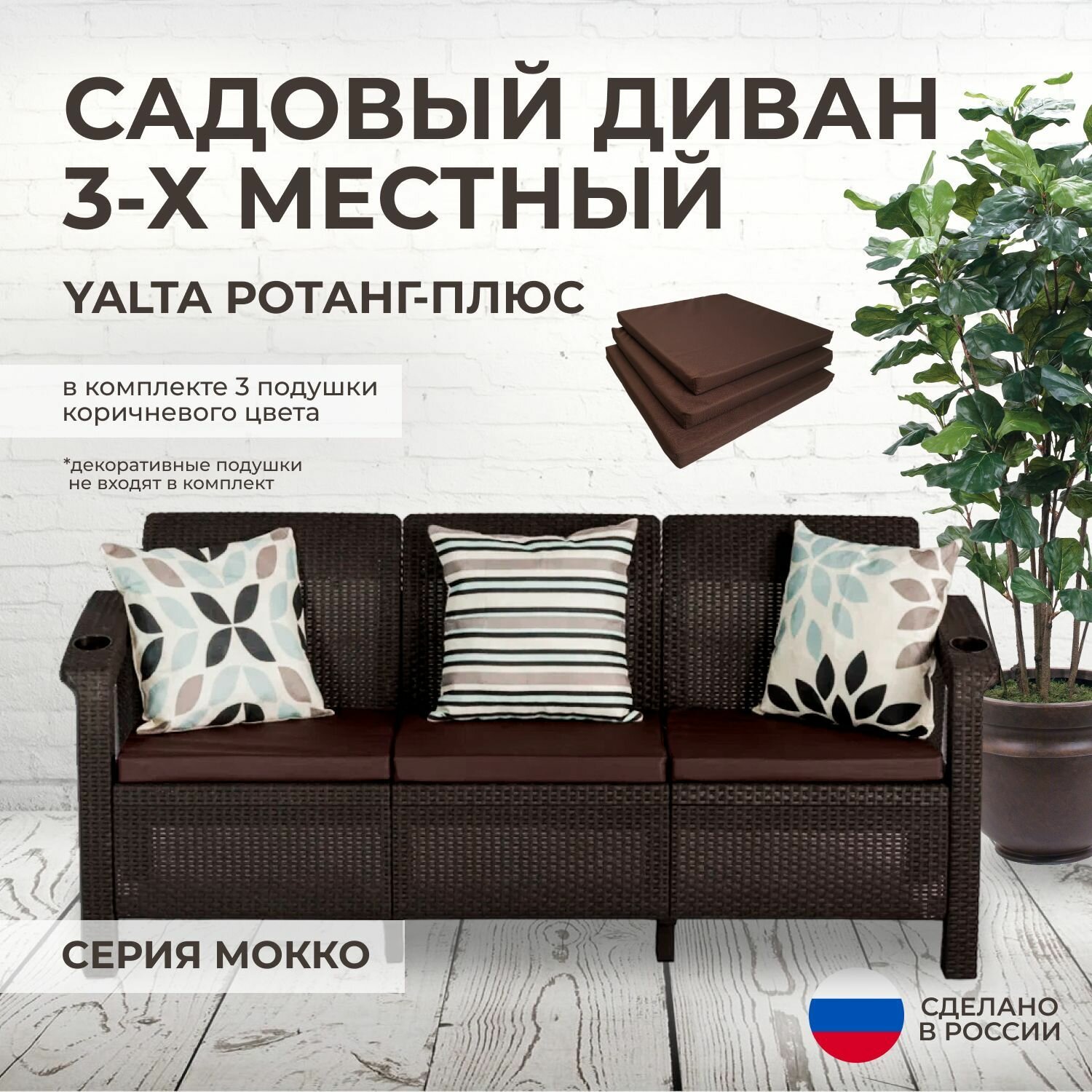 Диван садовый трехместный YALTA (Ялта Ротанг-плюс) + 3 коричневые подушки (искусственный ротанг (пластик) интересное: