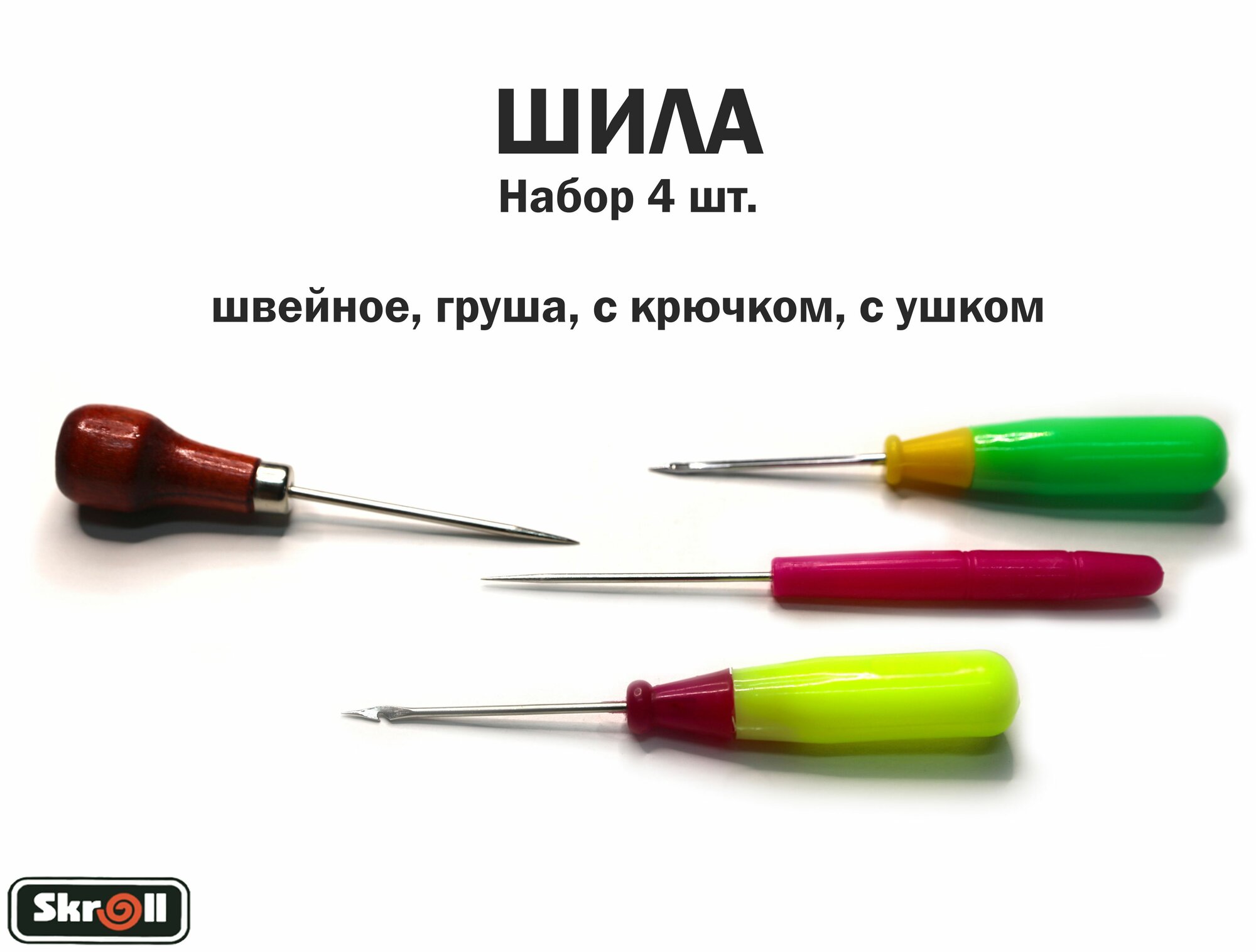 | Подробная комплектация | Набор 4 шт. 1. Швейное: диаметр: , длина шила без ручки: 6 см. 2. Груша: диаметр: 1,5-3 мм, длина шила без ручки: 6 см. 3. С крючком: диаметр: 1,5-3 мм, длина шила без ручки: 5,5 см. 4. С ушком: диаметр: 1,5-3 мм, длина шила без ручки: 5,5 см. |