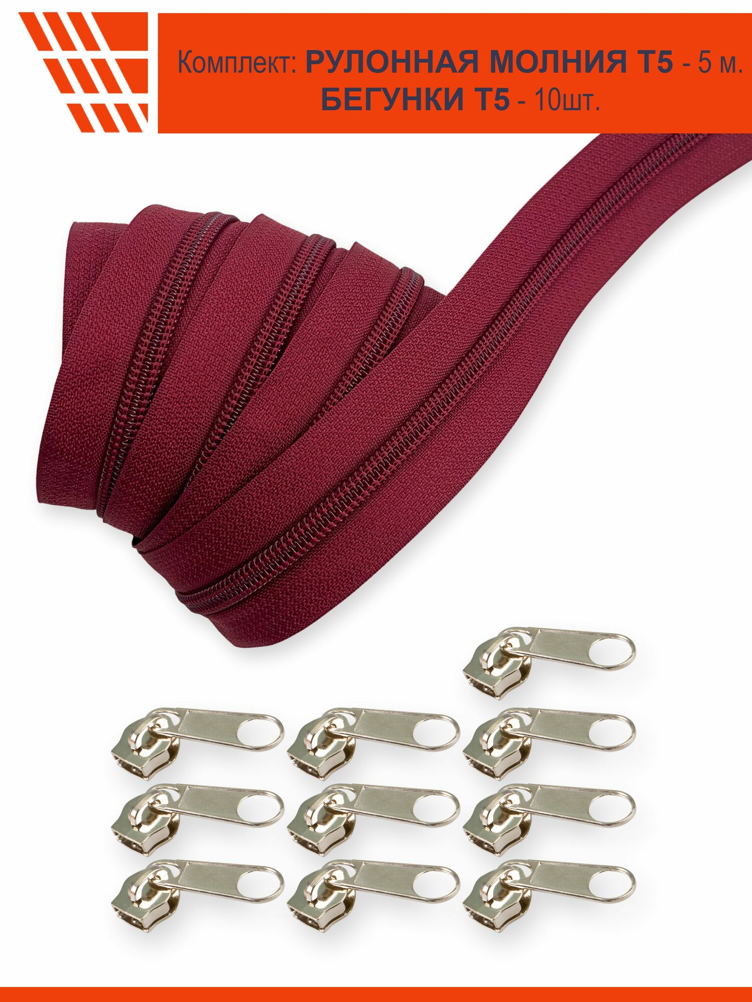 Купить Набор: Молния витая рулонная, Т5, 5 м., Бордовая и Бегунки, Т5, Галантерейные, 10 шт., Никель