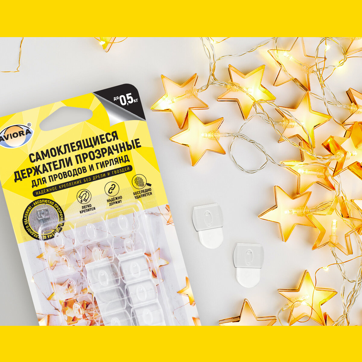 Самоклеящиеся крючки/держатели для проводов/гирлянд AVIORA (4 шт. в упаковке + 5 самоклеющихся полосок)