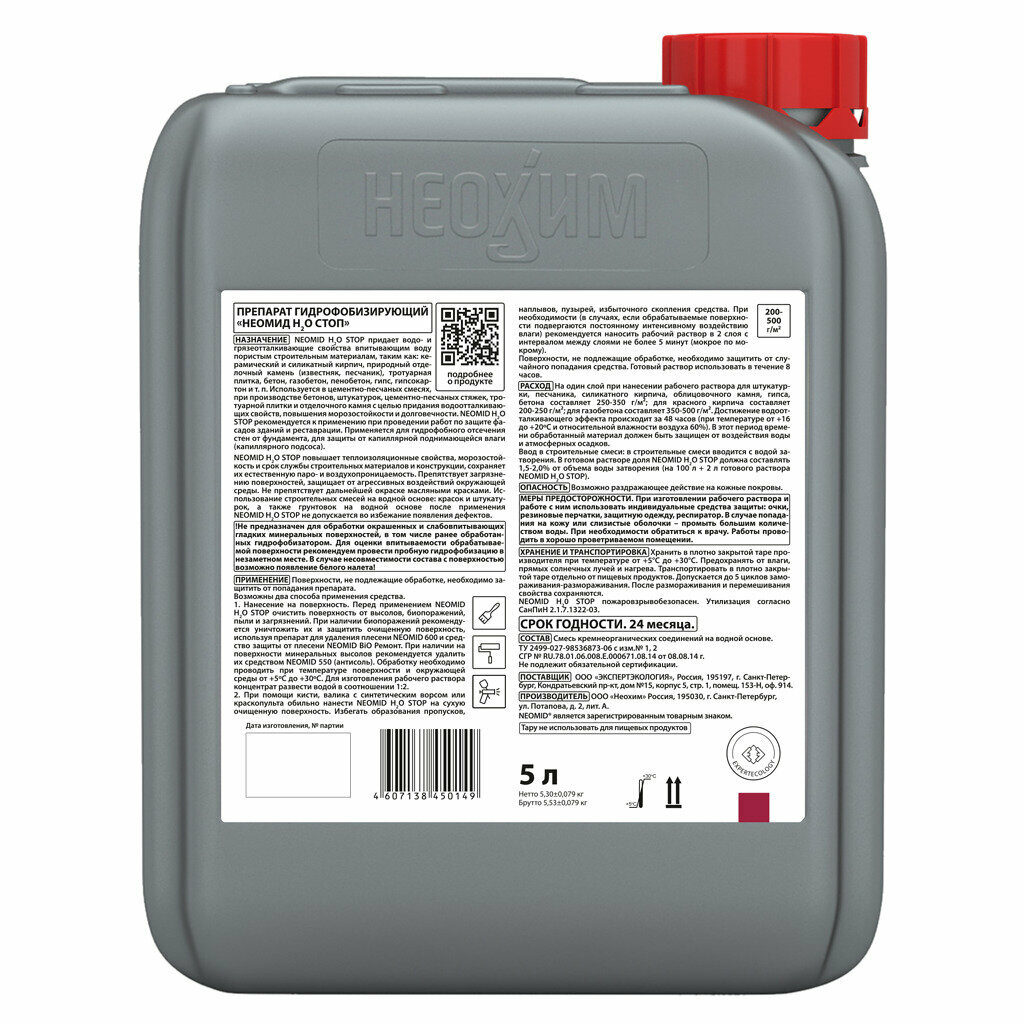 Гидрофобизатор - влагоизолятор NEOMID H2O STOP (5 л.)- пропитка по камню