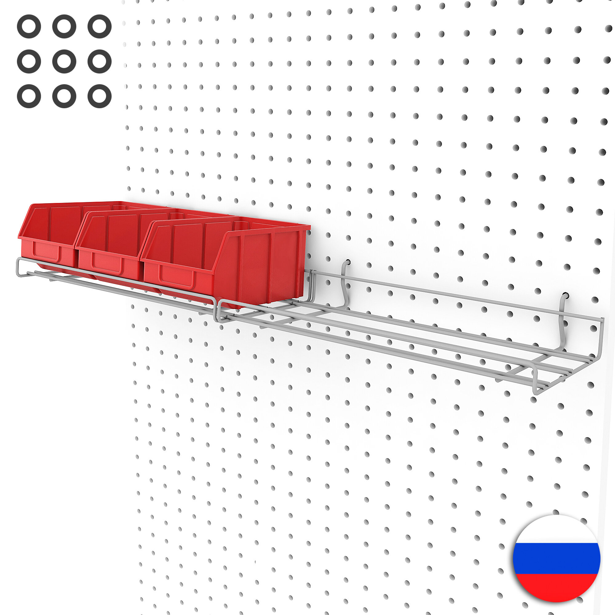 Металлическая полка и 3 красных лотка по 1 литру, 30*17*8 см. Для хранения мелких предметов на перфорированной панели.
