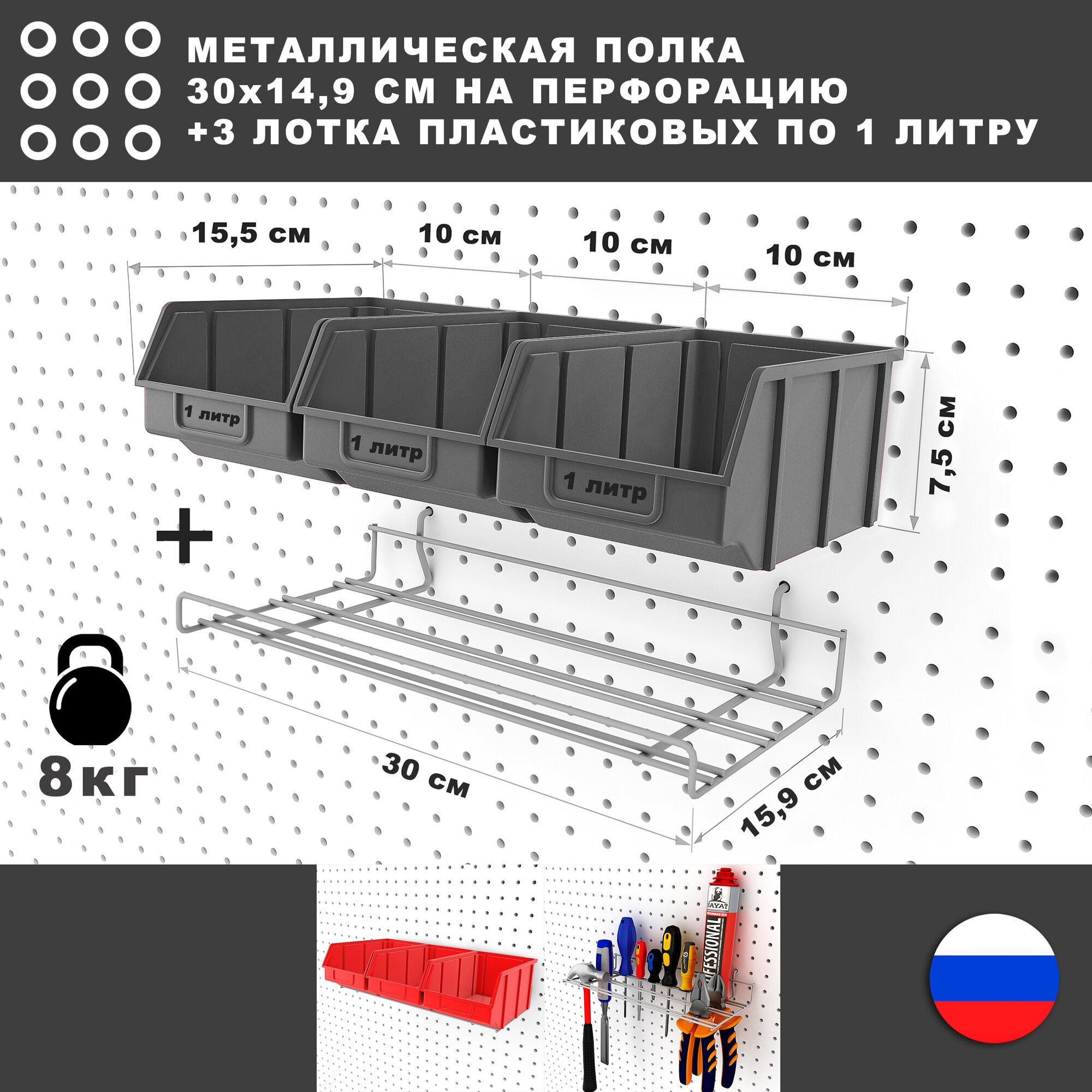 Металлическая полка и 3 серых лотка по 1 литру, 30*17*8 см. Для хранения мелких предметов на перфорированной панели.
