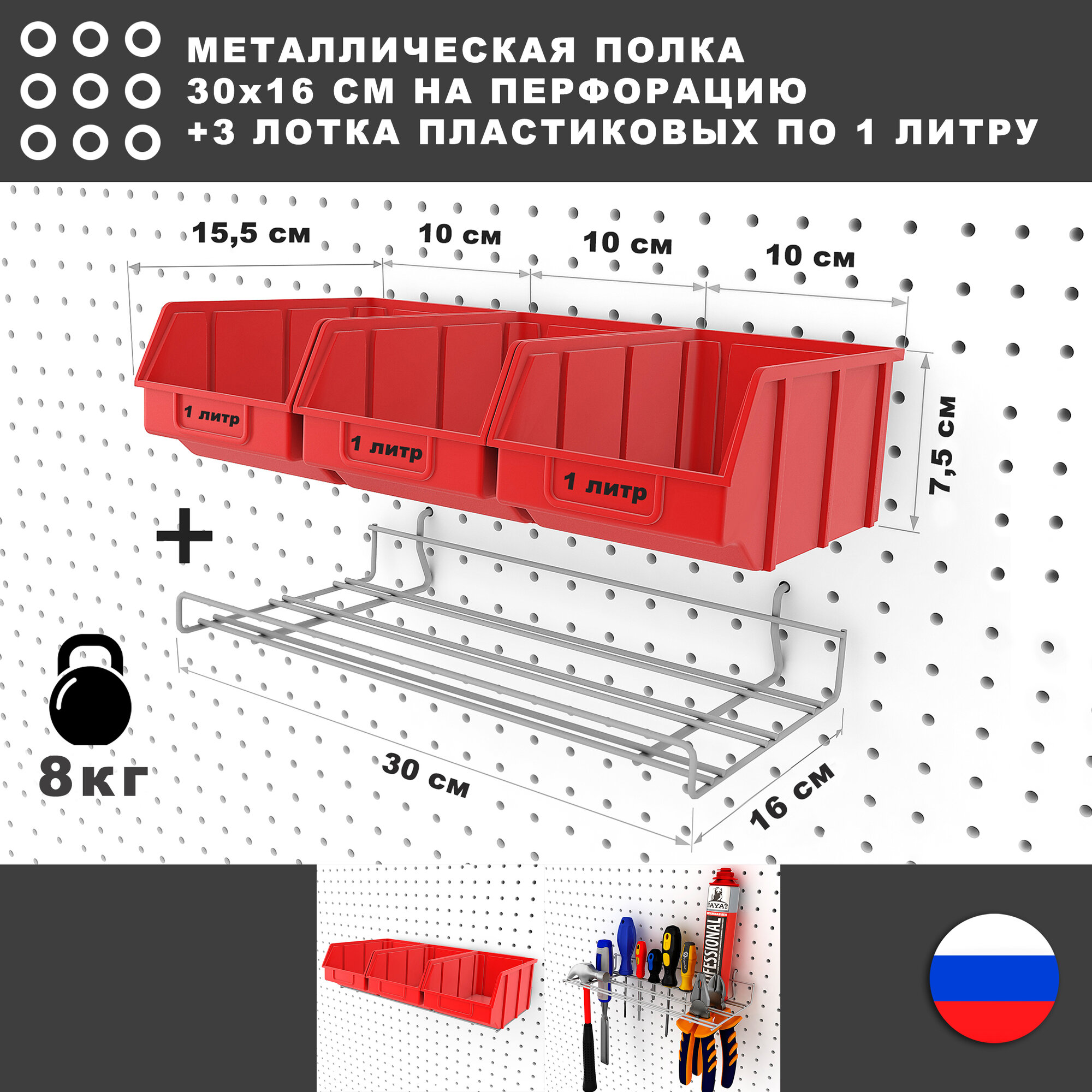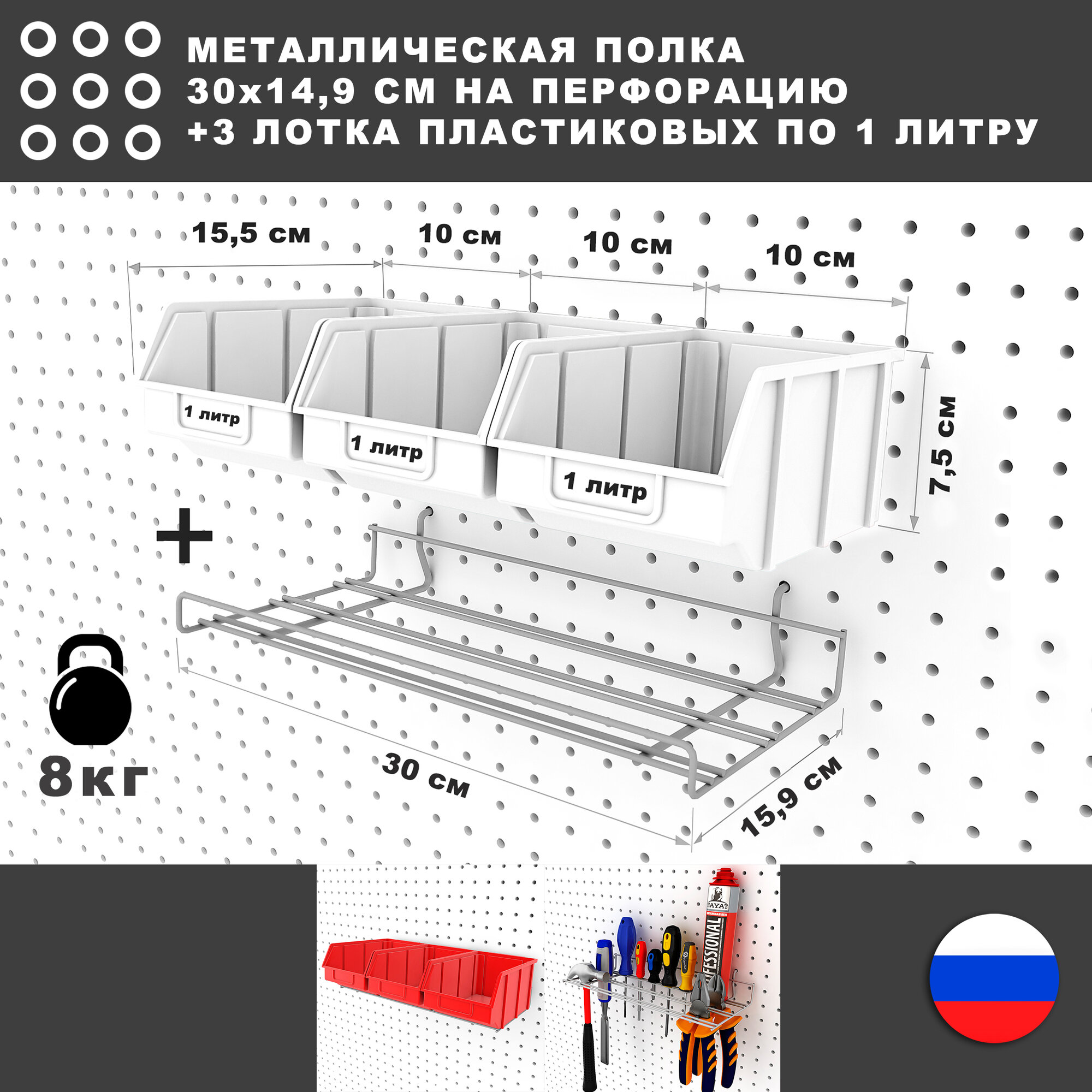 Купить Металлическая полка и 3 серых лотка по 1 литру, 30*17*8 см. Для хранения мелких предметов на перфорированной панели.