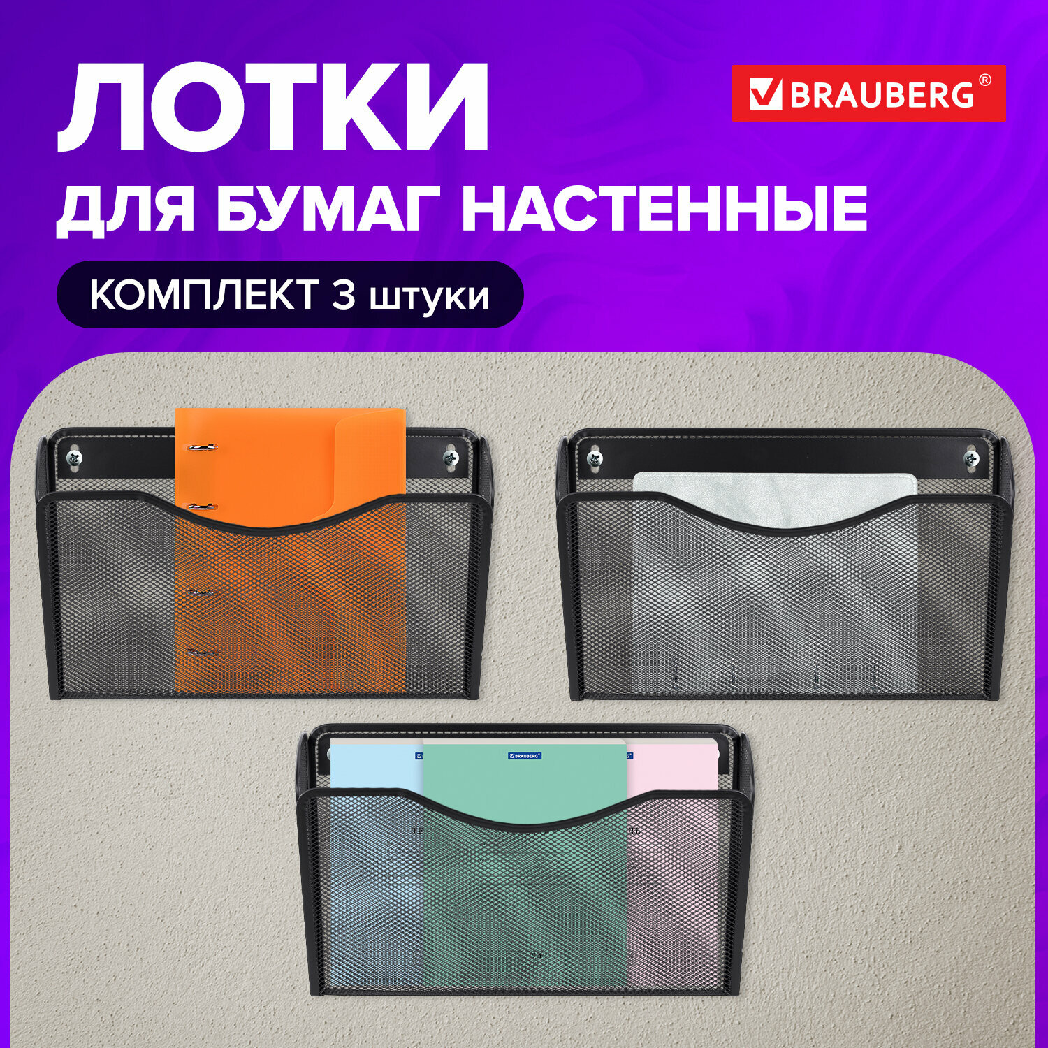 Лоток / подставка / органайзер настенный канцелярский для документов / бумаг Brauberg Germanium, 3 штуки, А4, 215х355х95 мм, металл, черный, 237968 интересное: