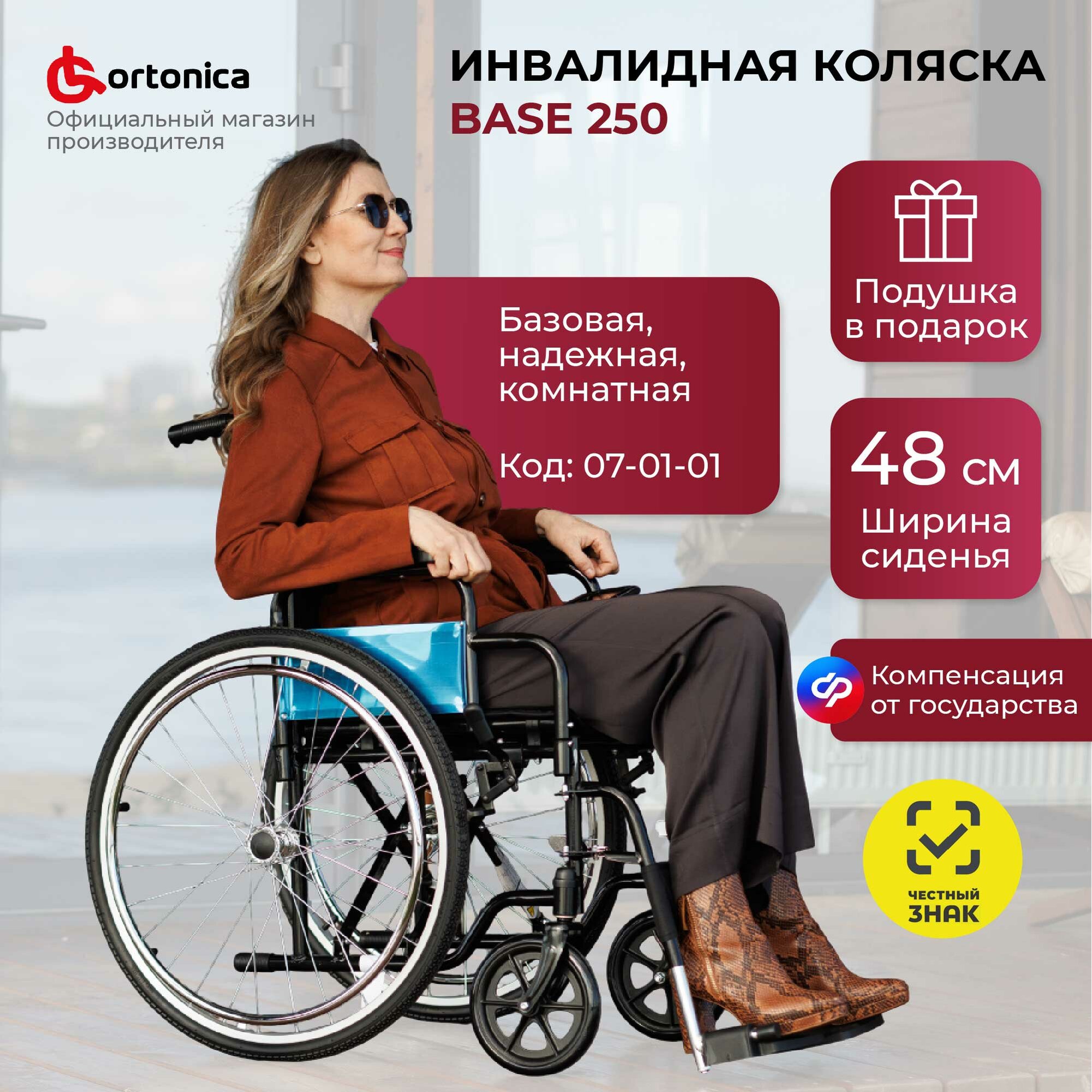 Набор кресло-коляска Ortonica Base 130/Base 250 инвалидная прогулочная механическая ширина сиденья 43 см задние пневматические колеса, передние литые + подушка