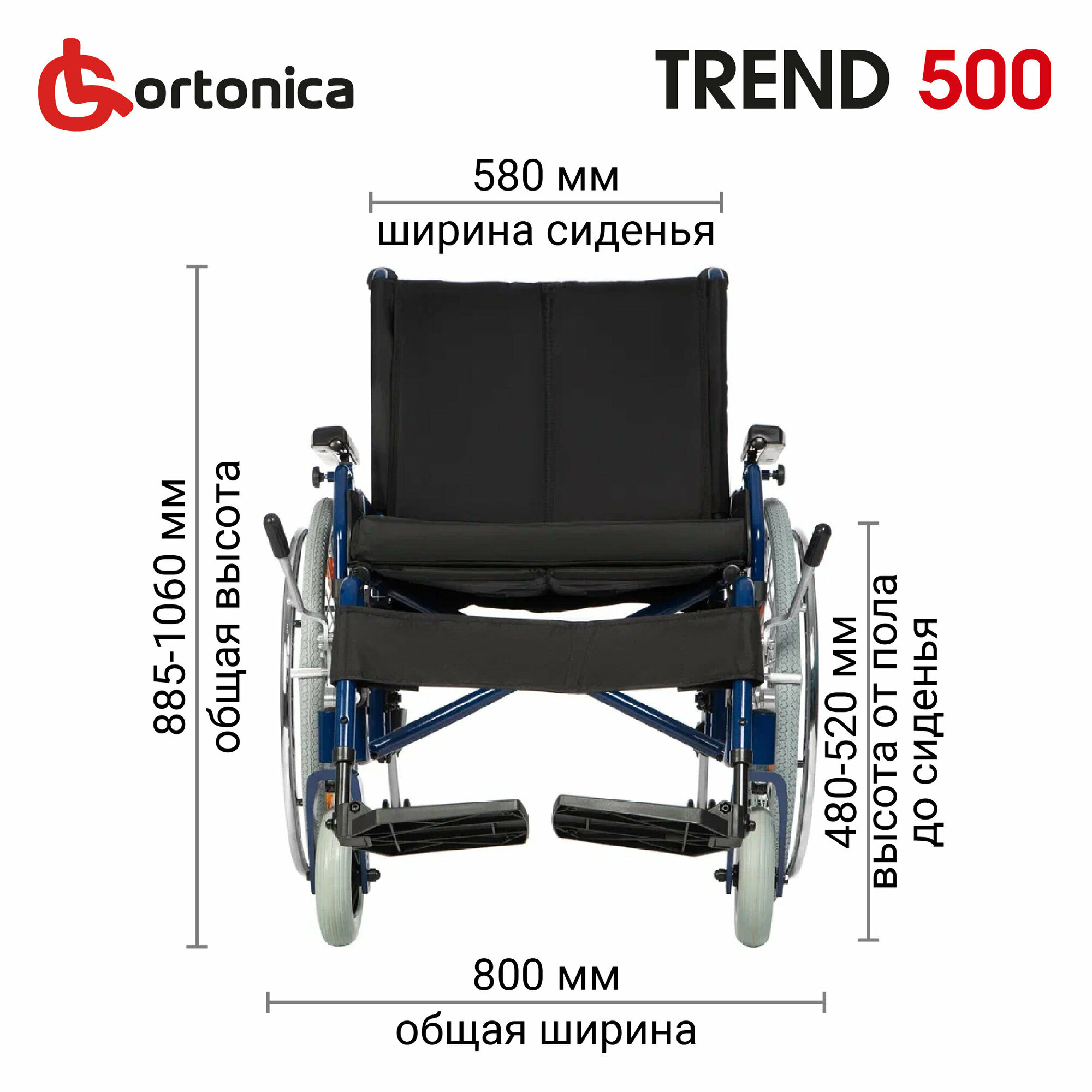 Кресло-коляска для инвалидов комнатная повышенной грузоподъемности до 180 кг Ortonica Trend 60/Trend 500 53UU ширина сиденья 53 см литые/литые Код ФСС 07-01-07