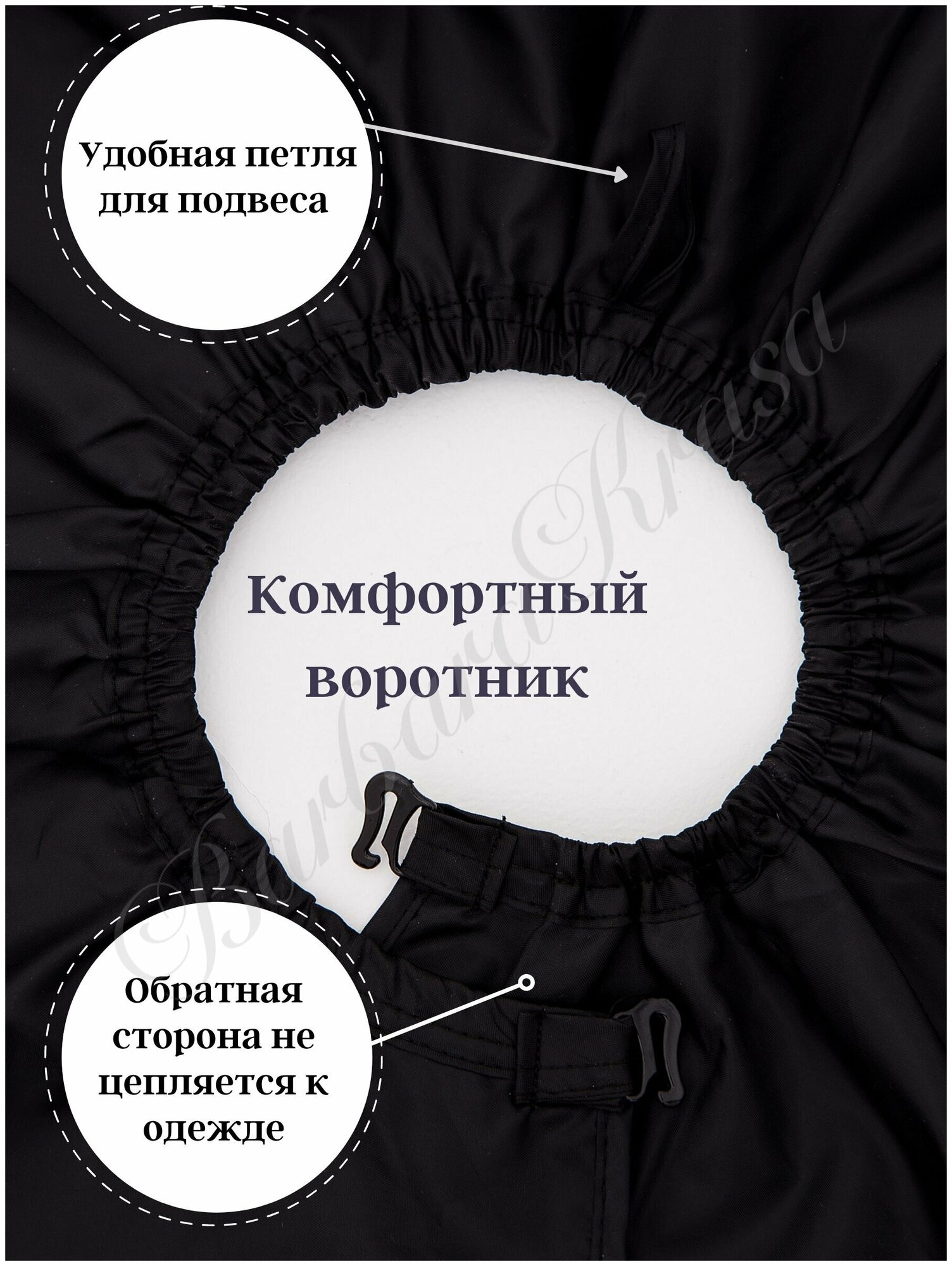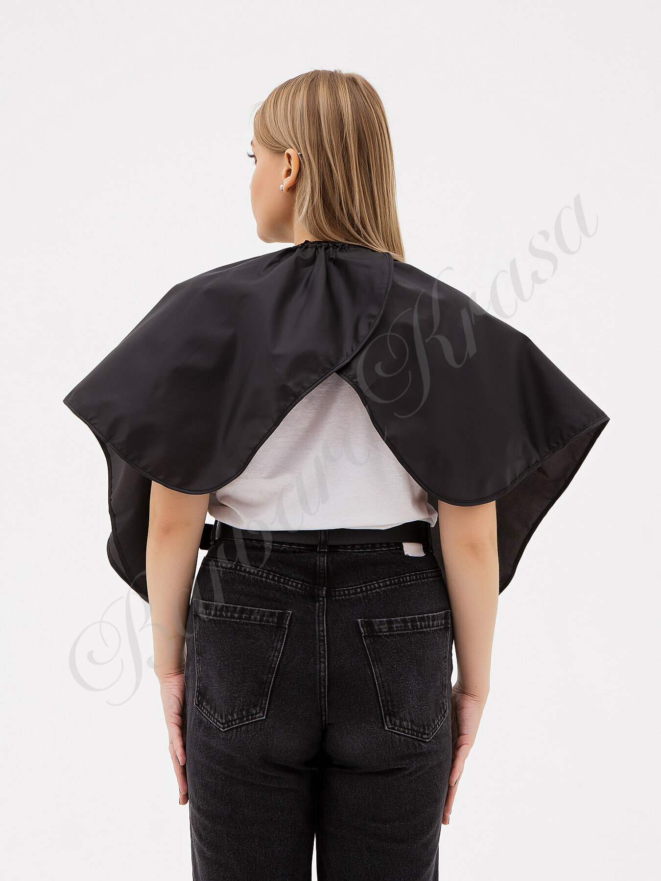 | Дополнительная информация | Накидывается на плечи модели, Крепится вокруг шеи с помощью крючков, Крючки крепятся за резинки (см фото и видео) Для достижения максимальных антистатических свойств материала, рекомендуется перед первой стиркой замочить пеньюар в кондиционере для белья |