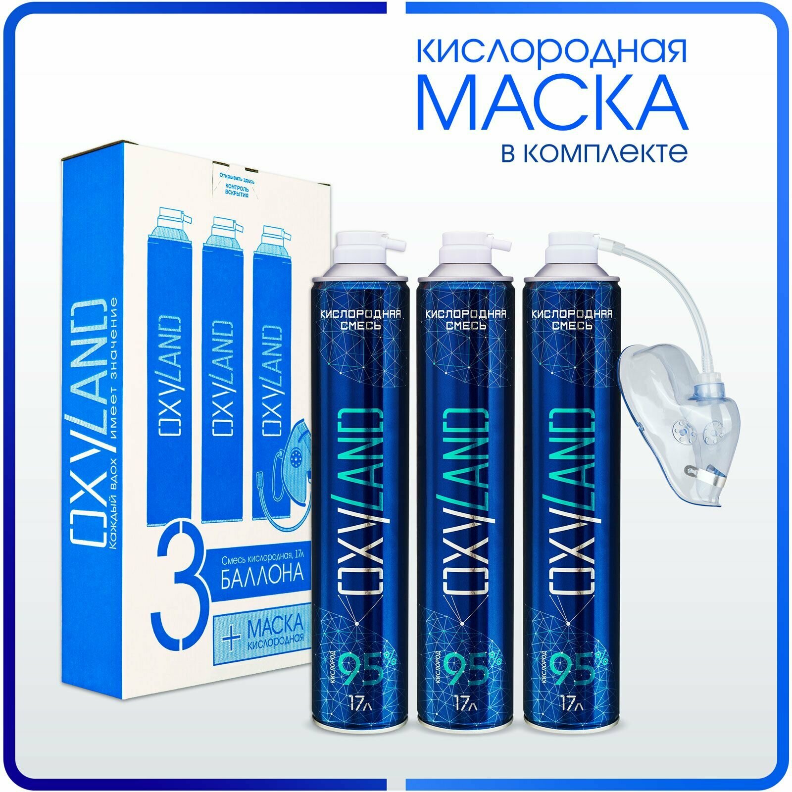 | Комплектация | Кислородный баллончик OXYLAND - 3 шт, Маска кислородная - 1 шт, Трубка соединительная - 1 шт. |