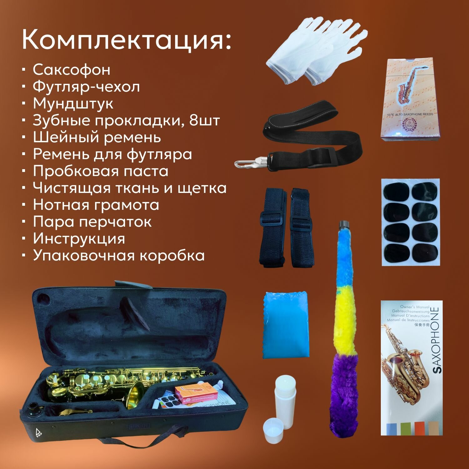 | В комплекте | Саксофон, Футляр-чехол, Мундштук, Зубные прокладки (8 шт.), Шейный ремень , Ремень для футляра, Пробковая паста, Чистящая ткань и щетка, Нотная грамота, Пара перчаток, Инструкция, Упаковочная коробка |