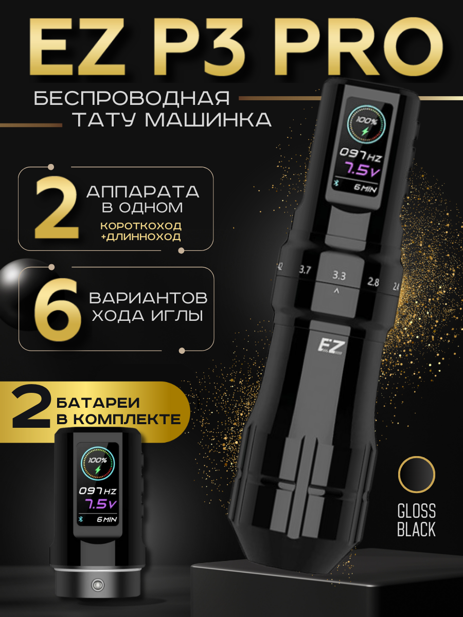 Купить Беспроводная тату машинка EZ P3 PRO Gloss Black с регулируемым ходом иглы и 2 акккумуляторами