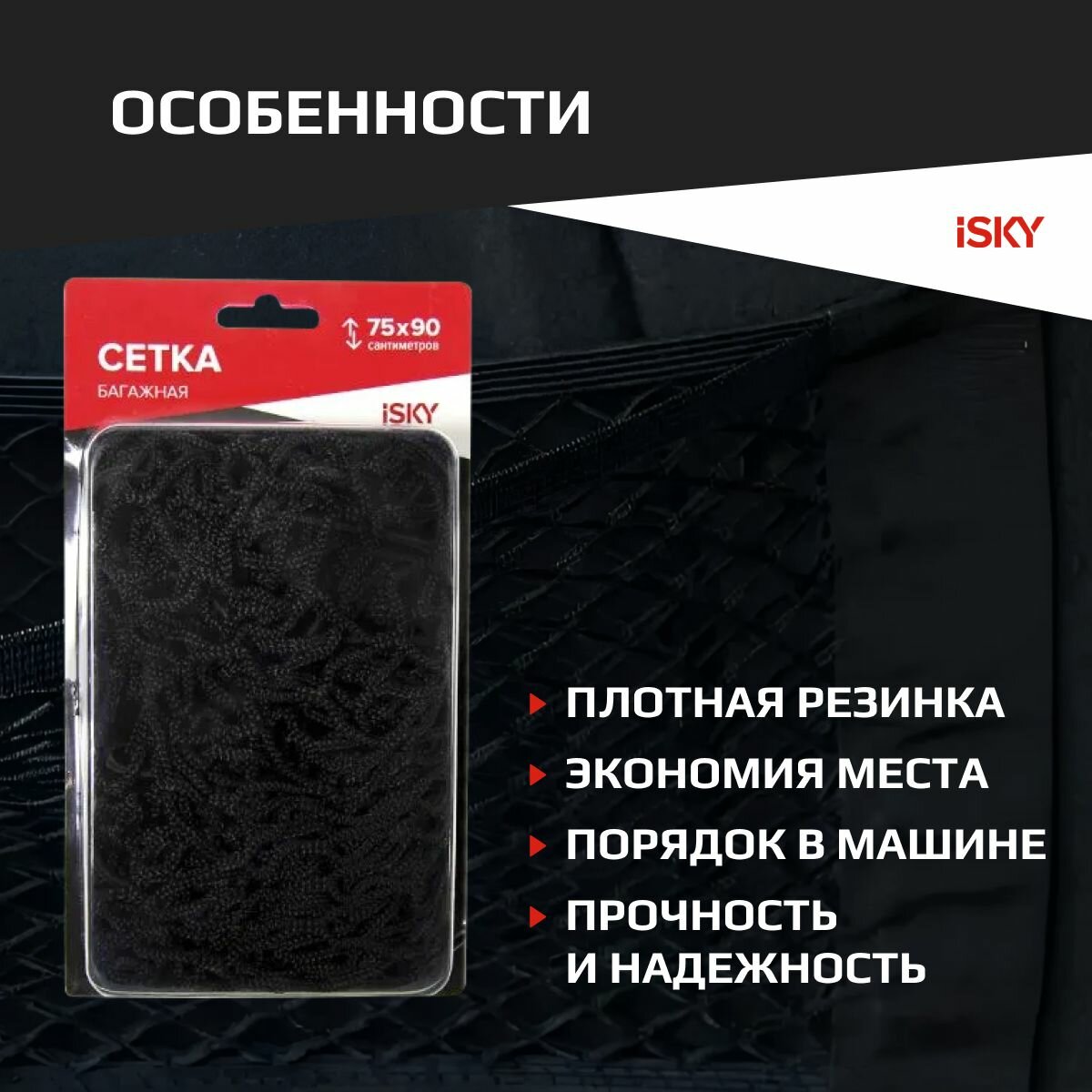СохранитьСетка-карман в багажник iSky, 75x90 см (4 крюка) арт. iCN-7590 интересное: