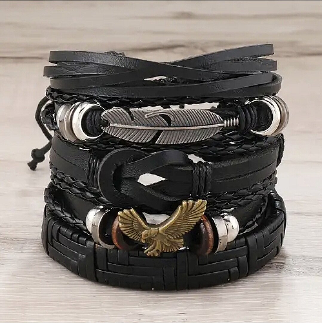 | Дополнительная информация | Браслет на завязках безразмерный, кожаный, бижутерия, украшение на руку, комплект\набор 5 в 1 |