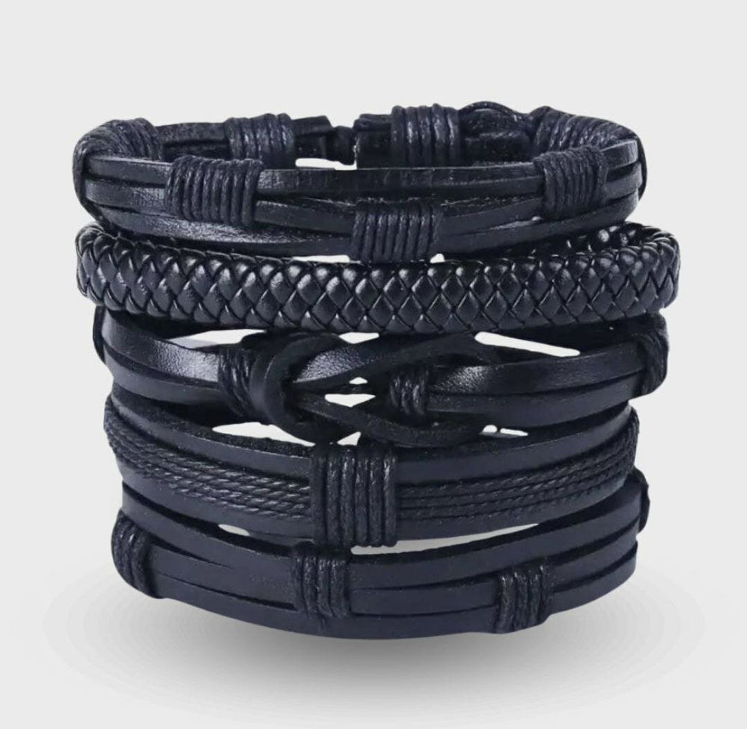 | Дополнительная информация | Браслет на завязках безразмерный, кожаный, бижутерия, украшение на руку, комплект\набор 5 в 1 |