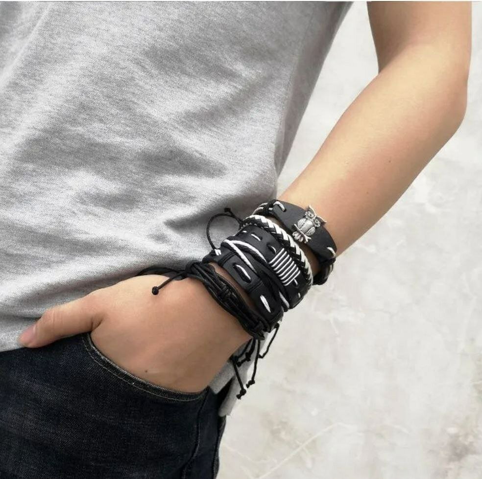 | Дополнительная информация | Браслет на завязках безразмерный, кожаный, бижутерия, украшение на руку, комплект\набор 5 в 1 |