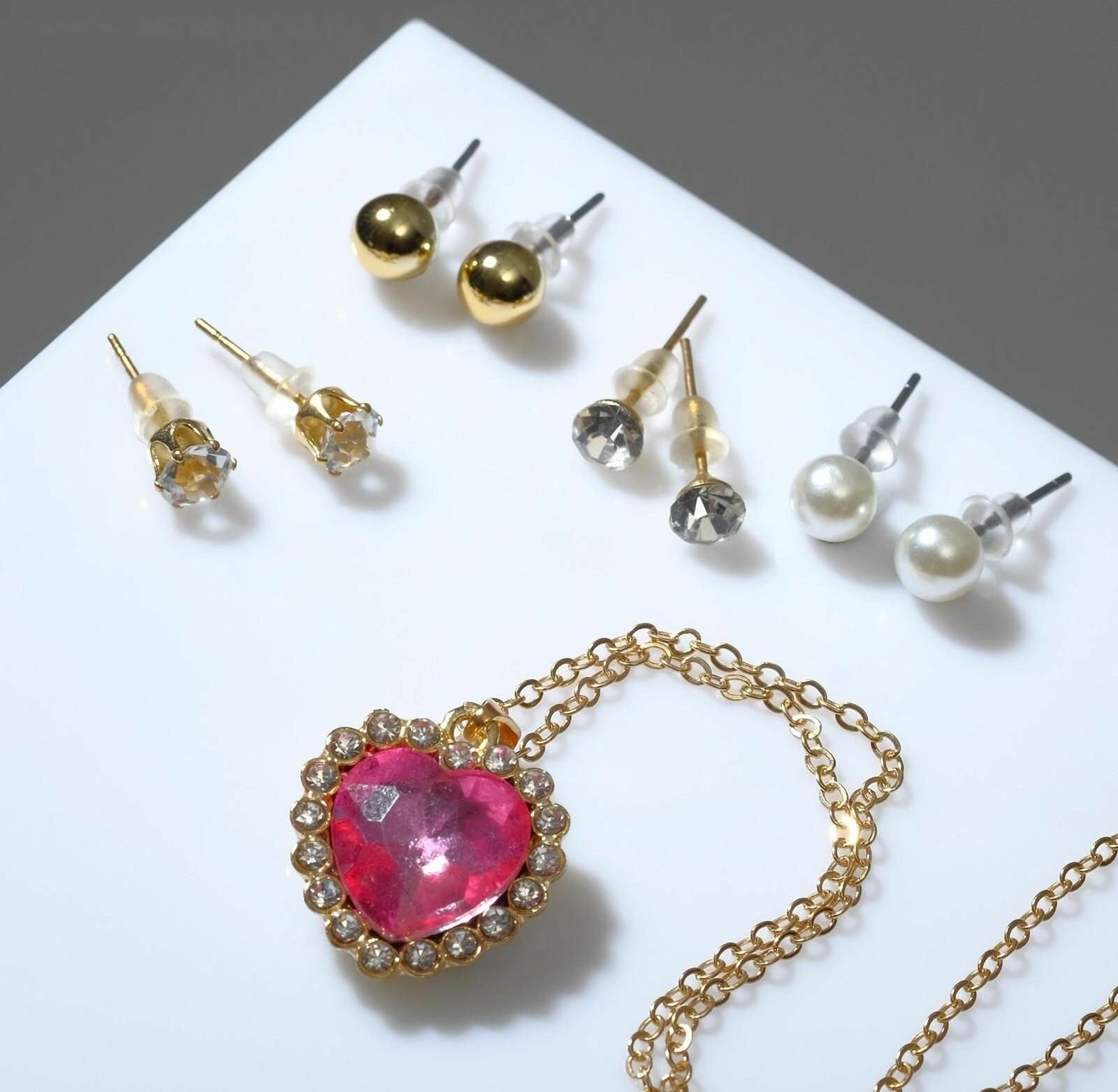 Купить Набор бижутерии Queen fair "Сердечко", 4 пары пусет, кулон, бело-розовые в золоте, 45 см