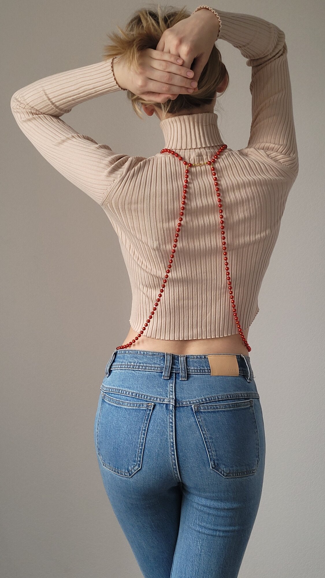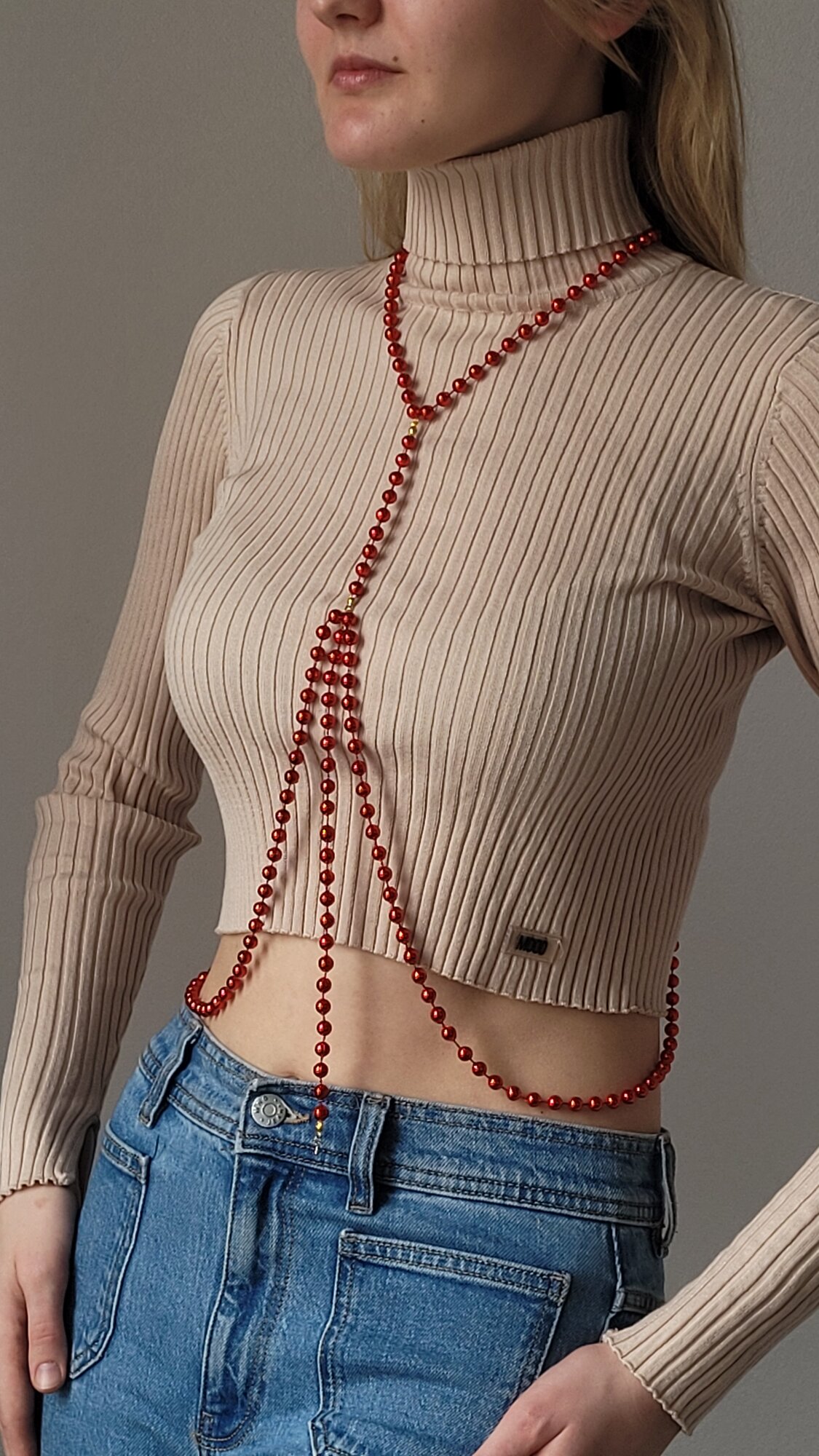 СохранитьБодичейн, красная цепочка на тело и плечи из бусин интересное: