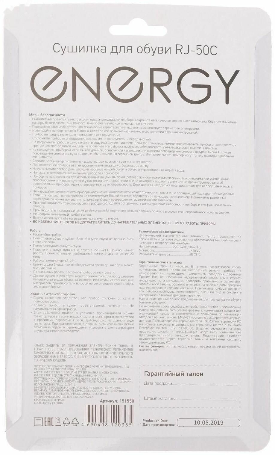 Energy Сушилка для обуви блистер Rj-50c 151550 .