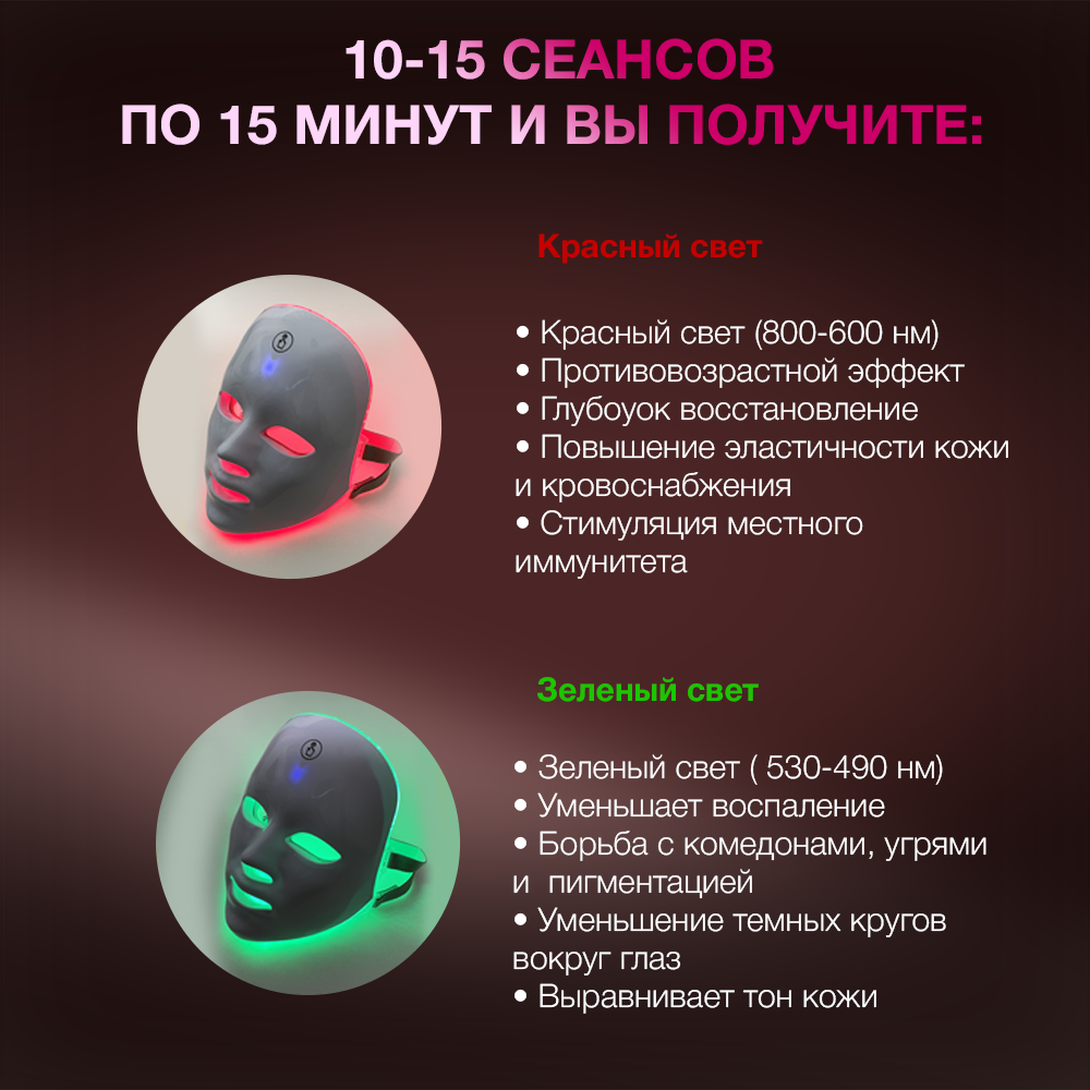 | Дополнительные характеристики функций светового воздействия | Красный свет (800-600 нм): противовозрастной эффект, глубокое восстановление, повышение эластичности кожи и кровоснабжения, стимуляция местного иммунитета. Желтый свет (580-550 нм): улучшает отток лимфы, активизирует синтез коллагена, уменьшает морщины, повышает местный иммунитет, улучшает состояние увядающей кожи. Зеленый свет (530-490 нм): уменьшает воспаление, борьба с комедонами, угрями и пигментацией, уменьшение темных кругов вокруг глаз, выравнивает тон кожи. Голубой свет (480-460 нм): нормализация жирности кожи при повышенной сухости, борьба с куперозом, противовоспалительный эффект. Синий свет (450-440 нм): борьба с куперозом, акне и рубцами, дает противоотечный и противовоспалительный эффект. Фиолетовый свет (430-390 нм): нормализует водно-минеральный обмен в коже, улучшает отток лимфы, ускоряет регенерацию клеток, нормализация жирности кожи при повышенной сухости. Белый свет (510 нм): борьба с пигментацией, придает блеск коже, активизирует образование меланина, подтягивает кожу. |