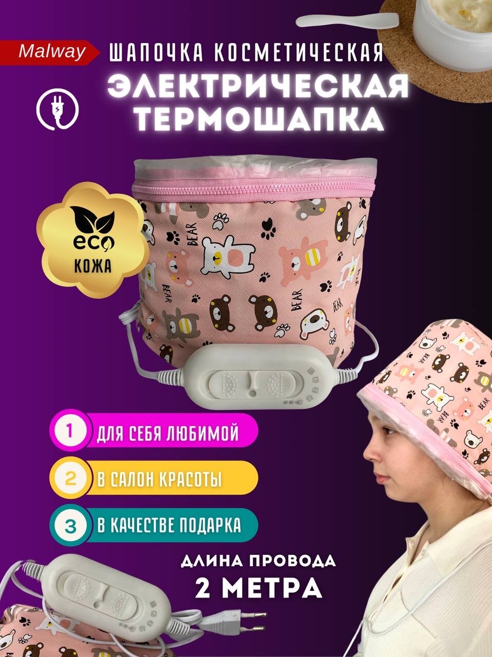Термошапка электрическая Malway "Мишки на бежевом", для масок, для волос , экокожа,