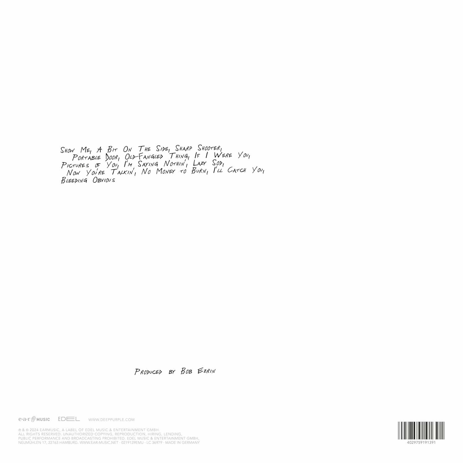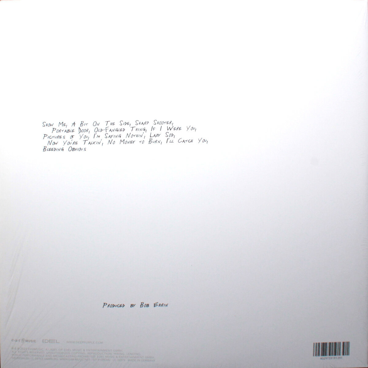 | Треклист | A1. Show Me A2. A Bit On the Side A3. Sharp Shooter A4. Portable Door B1. Old-Fangled Thing B2. If I Were You B3. Pictures of You B4. I'm Saying Nothin' C1. Lazy Sod C2. Now You're Talkin' C3. No Money To Burn D1. I'll Catch You D2. Bleeding Obvious |