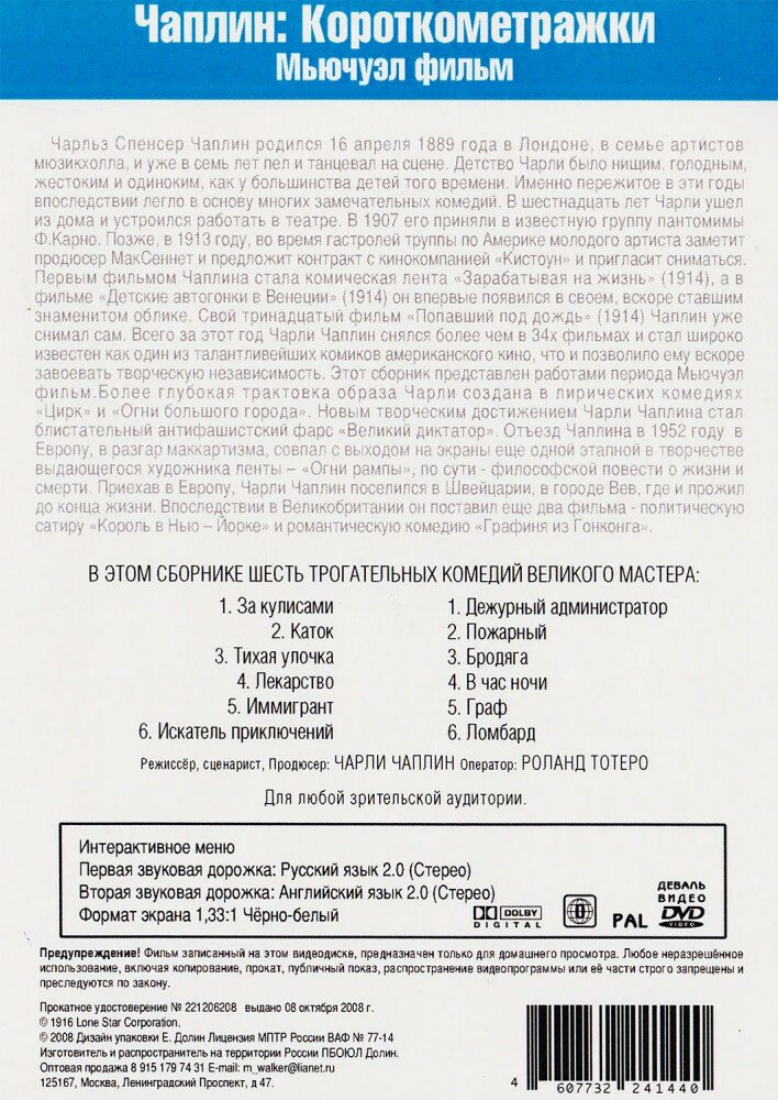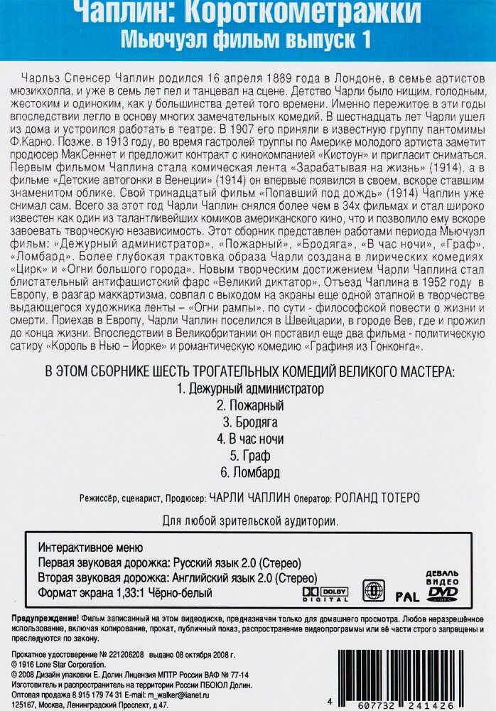 Чарли Чаплин: Короткометражки Мьючуэл фильм, выпуск 1-2 (2 DVD) (1916 год, ДВД диск, DVD Box + картон) интересное: