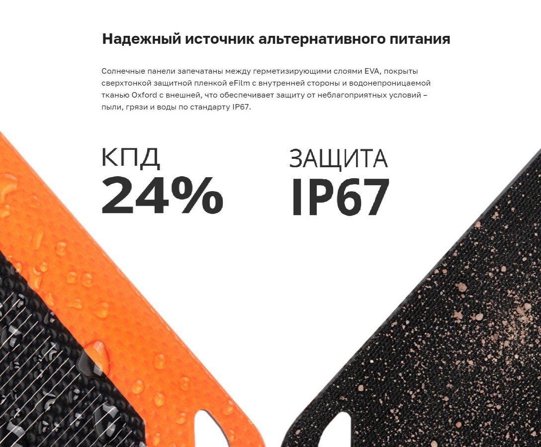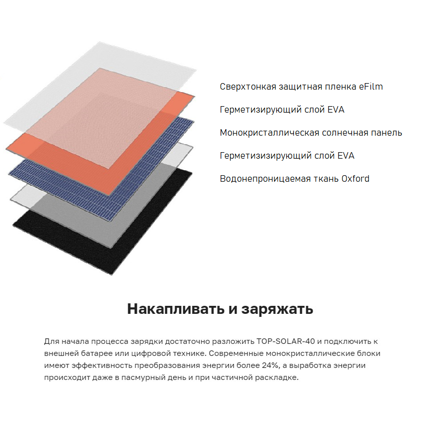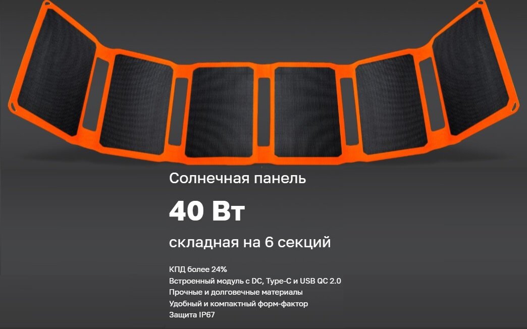 | Подробная комплектация | Солнечная батарея TOP-SOLAR-40 40W DC 19.8V, USB QC3.0 и Type-C, влагозащищенная IP67, складная на 6 секций |